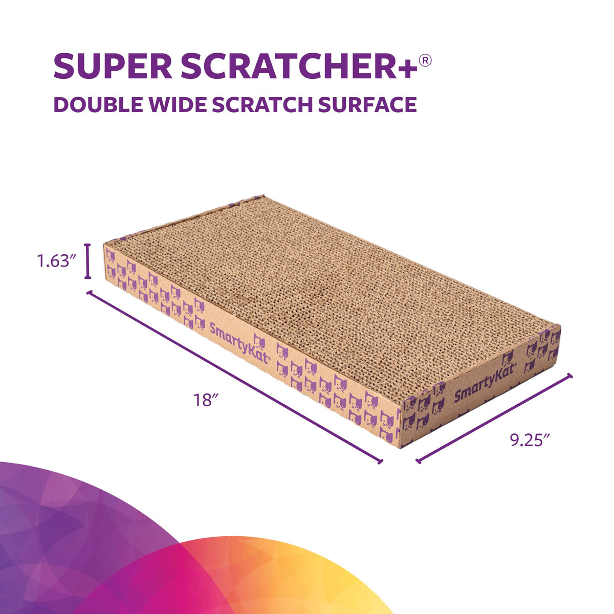 Q: What is the size of the SmartyKat Super Scratcher+?A: The SmartyKat Super Scratcher+ measures 18 inches in length, 9.25 inches in width, and 1.63 inches in height, making it a double-wide scratching pad that offers ample space for your cat to scratch comfortably.