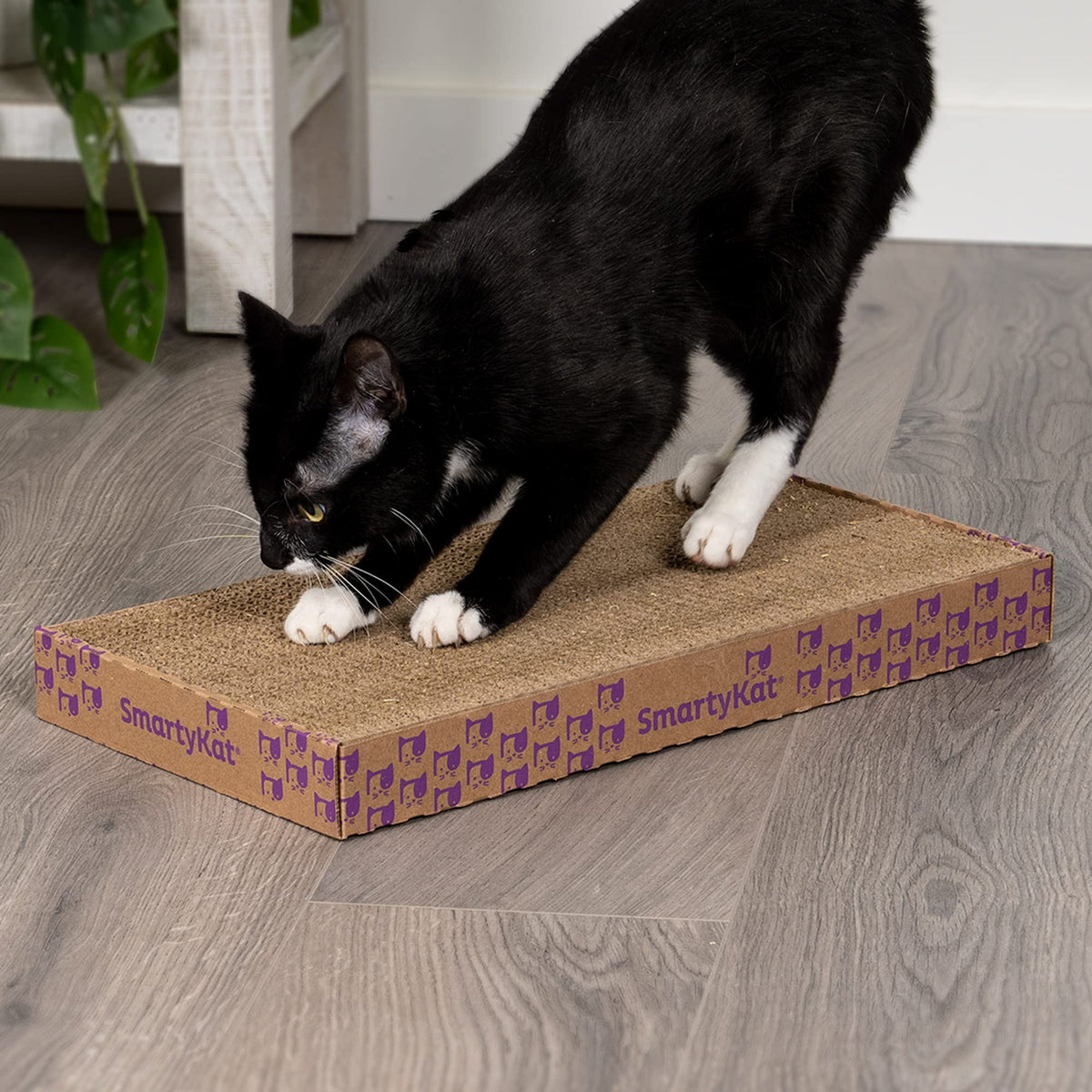 Q: Is the SmartyKat Super Scratcher+ safe for my cat?A: Yes, the SmartyKat Super Scratcher+ is made from recycled, corrugated cardboard and is designed to be gentle on your cat's nails. Additionally, SmartyKat products are designed with child safety standards in mind, ensuring a safe environment for both kids and pets.