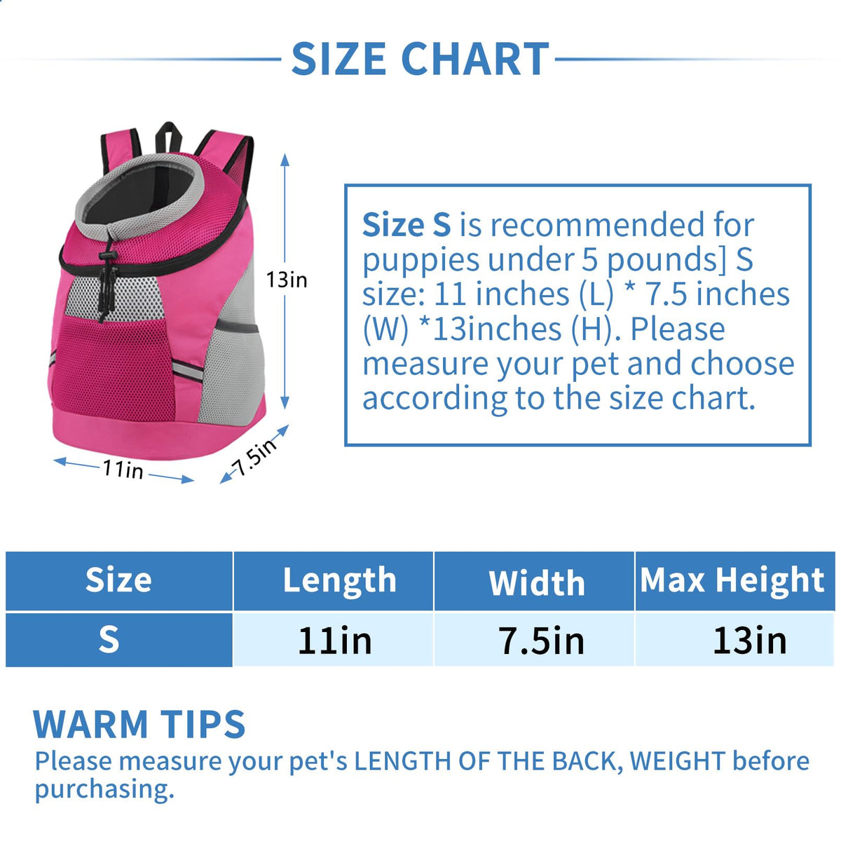 Size:Medium Note: 1. Please Measure Your Pet Before Your Purchase Especially Attention To The Size Chart. 2. Recommended For Small Dogs Under 16 Lb. 3. Please Based On The Measured Size, The Suggested Weight Is Only For Reference. 4. Please Allow Slight Deviation For The Measurement Data Due To Manual Measurement. 5. Size Measurement Should Allow Room For 2 Fingers To Fit Between The Item And The Dog. Product Size: --S: Width 6.5Inch Height 8Inch Length 11Inch --M: Width 8Inch Height11Inch Length 11.5Inch --L: Width 10 Inch Height 14Inch Length 12.5Inch Why Choose Our Pet Carrier Backpack? Easy To Operate: Easy In And Easy Out, Very Convenient! With Zipper And Hook And Loop On Both Sides Of The Backpack,Convenient Pet Wear And Take Off. Breathable: Plenty Of Mesh Area Provide Adequate Ventilation And Keep Your Pet Cool. Comfortable: Sturdy Fabric With Sponge Padding Ensures Durability And Provides Comfort For You And Your Pet. Adjustable: Adjustable Strap Helps You To Balance Weight And Makes It More Comfortable Wear. The Neck Elastic Can Adjust The Size According To The Dog'S Or Cat'S Neck.