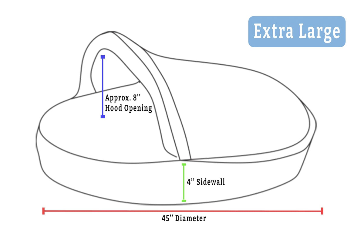 Q: What is the size and dimension of the Extra Large Snoozer Cozy Cave Pet Bed?A: The Extra Large Snoozer Cozy Cave Pet Bed has a diameter of 45 inches, a sidewall height of 4 inches, and an approximate hood opening of 8 inches, making it ideal for larger dog breeds.