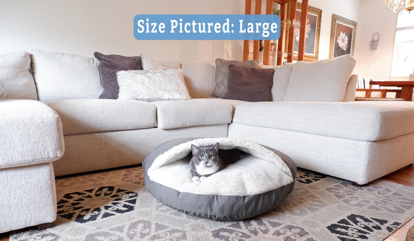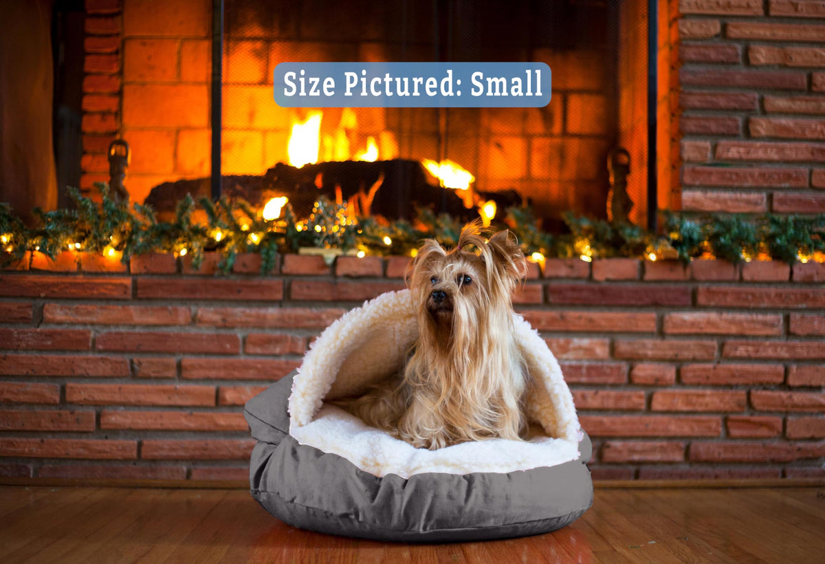 Is your dog a cuddler? A burrower? The Cozy Cave dog bed is just what you’re looking for! The hooded dog bed design lets your dog snooze between layers of soft Sherpa lining for enveloped comfort and coziness. Made to appeal to a dog’s natural instincts for burrowing, the Cozy Cave is the best dog bed for dogs who love sleeping under blankets. The Cozy Cave gives them a place to relax with a feeling of safety and security for less anxiety and more restful sleep. Sizes: Small: 25 in. Diameter x 4 in. Sidewall - Hood Height: Approximately 8 in. tall. Large: 35 in. Diameter x 4 in. Sidewall - Hood Height: Approximately 8 in. tall. X-Large: 45 in. Diameter x 4 in. Sidewall - Hood Height: Approximately 8 in. tall.