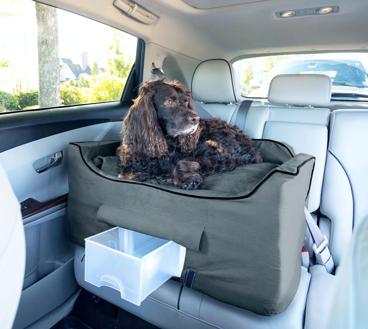Luxury lookout pet car seats by snoozer are microsuede beds that keep your small dog safe in the car while raising them up to see out the window, reducing anxiety. Poly filled pillow gives them a first class cushion, and has a removable cover for machine washing. For added convenience the pullout drawer model holds your dog's necessities. Connect the included adjustable tether strap to your dog's harness and loop the other end around your car's seatbelt strap. Large microsuede lookouts are recommended for dogs up to 35-pound.