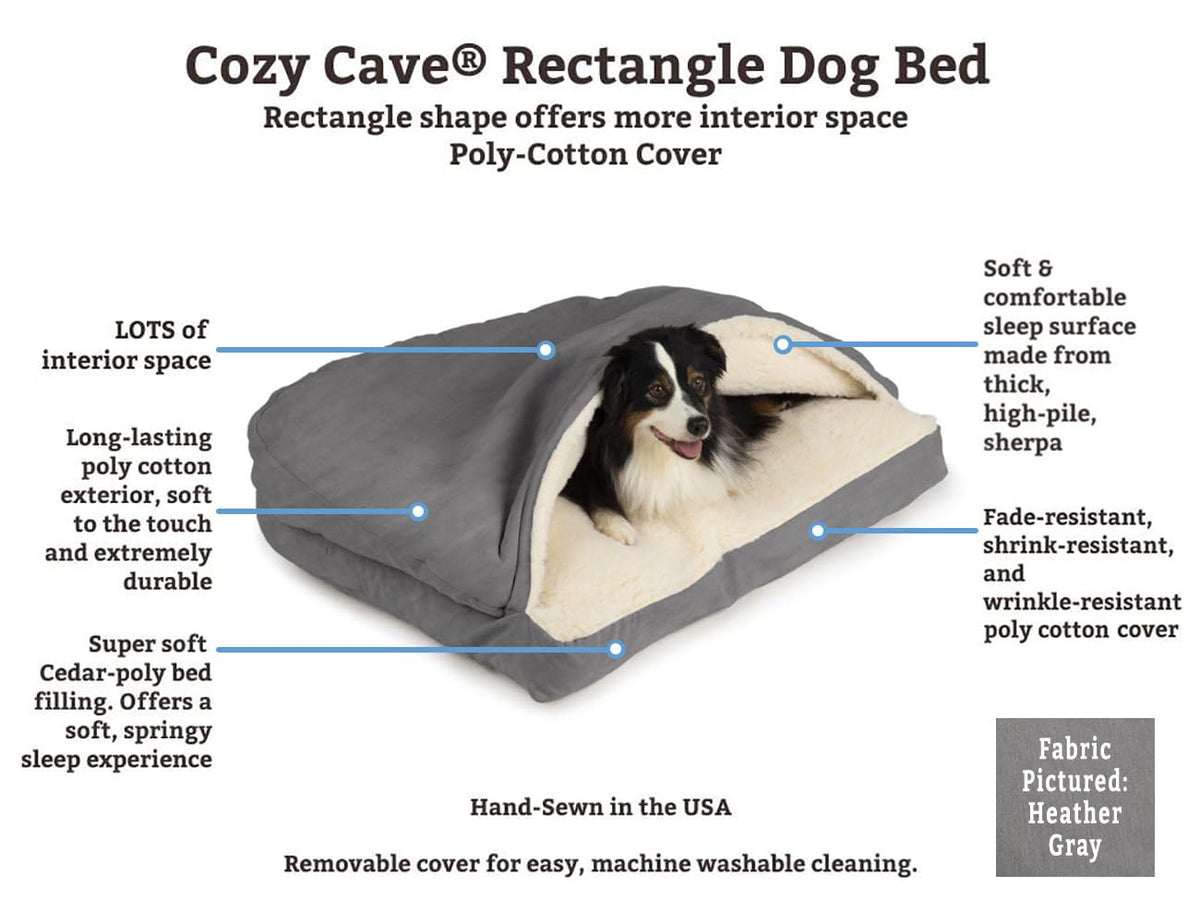 Cozy Cave Lovers Can Now Enjoy Their Favorite Snoozer Bed In An Even Larger, Strategically Shaped Rectangle Cave Bed. The Rectangle Shape Offers A Wider Opening For Entry And A Multitude Of Restful Positions For Your Pup. It Also Welcomes Multiple Pets Who Are Willing To Share Their Coveted Cave With A Furry Friend. Its New Modern Shape And Award-Winning Cave Design Can Coordinate With A Multitude Of Home Interior Designs. The Rectangle Cozy Cave Is Like A Hug For Your Dog. Is Your Dog A Cuddler? A Snuggler? A Burrower? Then The Cozy Cave Dog Bed Is Just What Youre Looking For! The Hooded Dog Bed Design Lets Your Dog Snooze Between Layers Of Soft Sherpa Lining For The Ultimate In Enveloped Comfort And Coziness. The Tubing In The Hood Lets You Adjust The Hood For A Looser, Cave-Like Structure Or Tighter Fit For A Blanket-Like Feeling To Suit Your Dogs Preferences. Our Dog Cave Bed Gives Them A Place Of Their Own To Relax With A Feeling Of Safety And Security For Less Anxiety And More Restful Sleep.