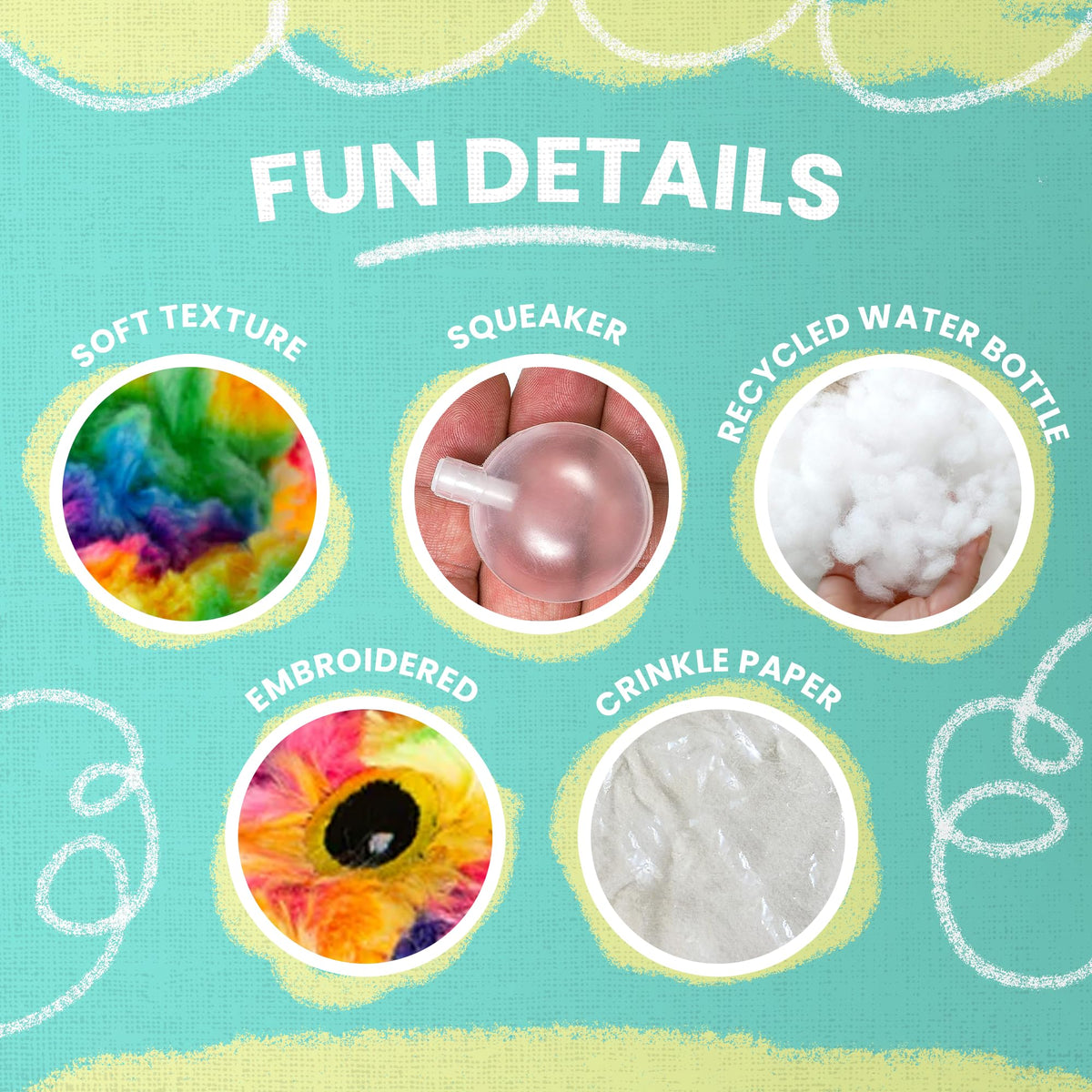 Q: What materials are used in the Snugarooz Momma Llama Dog Toy?A: The Snugarooz Momma Llama Dog Toy is made from super-soft, colorful tie-dye plush fabric and includes a cotton material for added durability.