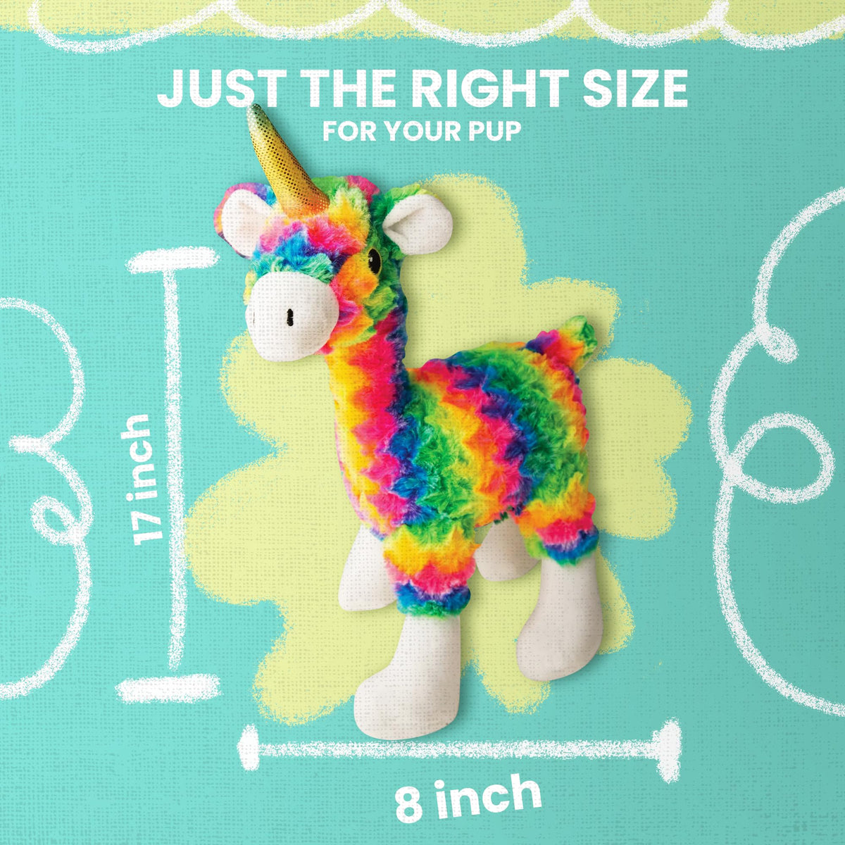 Super-Soft Tie-Dye Material: Momma Llama is made from ultra-soft, plush tie-dye fabric, making it a cozy and cuddly companion for your pup. | Iridescent Unicorn Horn: Features a magical iridescent unicorn horn, adding a fun and unique touch to this adorable llama toy. | Crinkle & Squeaker Sounds: Filled with hidden squeakers and crinkly material, Momma Llama provides engaging sounds that enhance your dog's playtime experience. | Perfect for Large Dogs: Measuring 15 inches, this toy is ideal for larger breeds that need a plush playmate for both cuddling and interactive play. | Repair Patch Included: Comes with a repair patch, allowing you to quickly fix minor damages and extend the life of this fun and lovable toy.