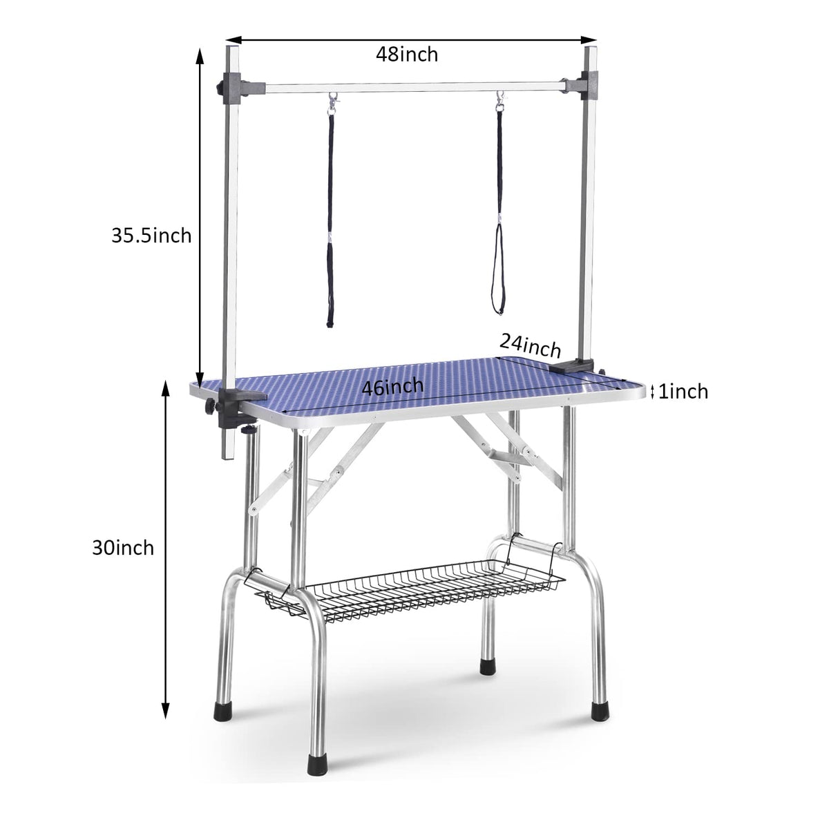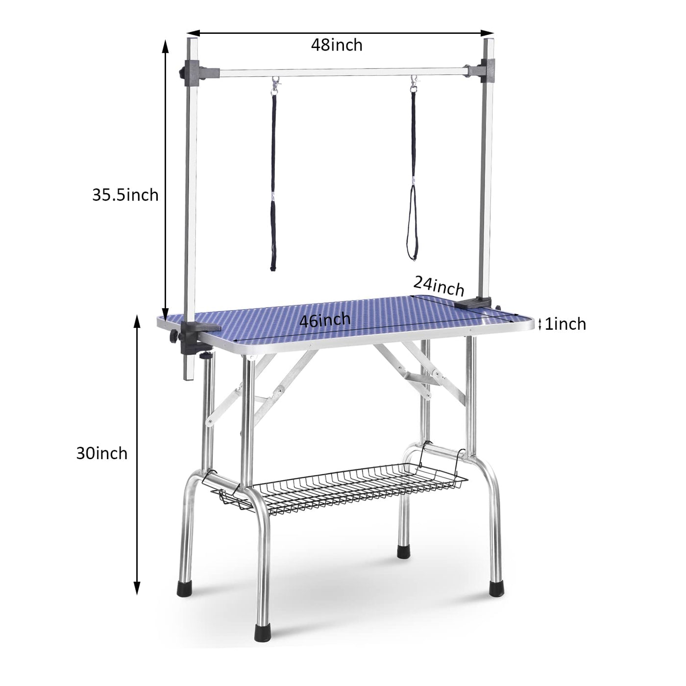 Upgraded Aluminum clamp & Rounded Table EdgesTwo grooming arms height can be easily adjusted by the clamp to meet your need and it can be adjusted to 31 inch H-frame with two nooses for varied needs Dimension & Additional Details46 x 24 x 30 inch (L x W x H)Tabletop Material: Aluminium Frame & Steel & Rubber Mat Surface color:BlackKindly noted that: It will have some rubber smell out of box but it is acceptable Please put it outside for a few days and the odor will be disappeared Stainless steel and durable wood boardsThis pet grooming table is constructed of durable MDF tabletop and stainless steel frame and legs including a metal mesh tray The good quality of the table will ensure its long-time service lifeHeavy duty stainless steel material Thoughtful rounded table edges avoid undesired damage or injury Anti-slip rubber in the feet adds stability and durability of the table Installation and Storage: collapsible and easy to assemble for convenient use and storage Easy to assemble and fold for compact storage to save space Folds up and down just seconds without any tools needed easy storage and space-saving when it is not use Weight capacity and Warrantyconstructed with selected premium MDF platform with rubber and heavy duty thick stainless steel frame The solid and stable structure with high load capacity up to 330lb We offer one year warranty and lifetime technical support