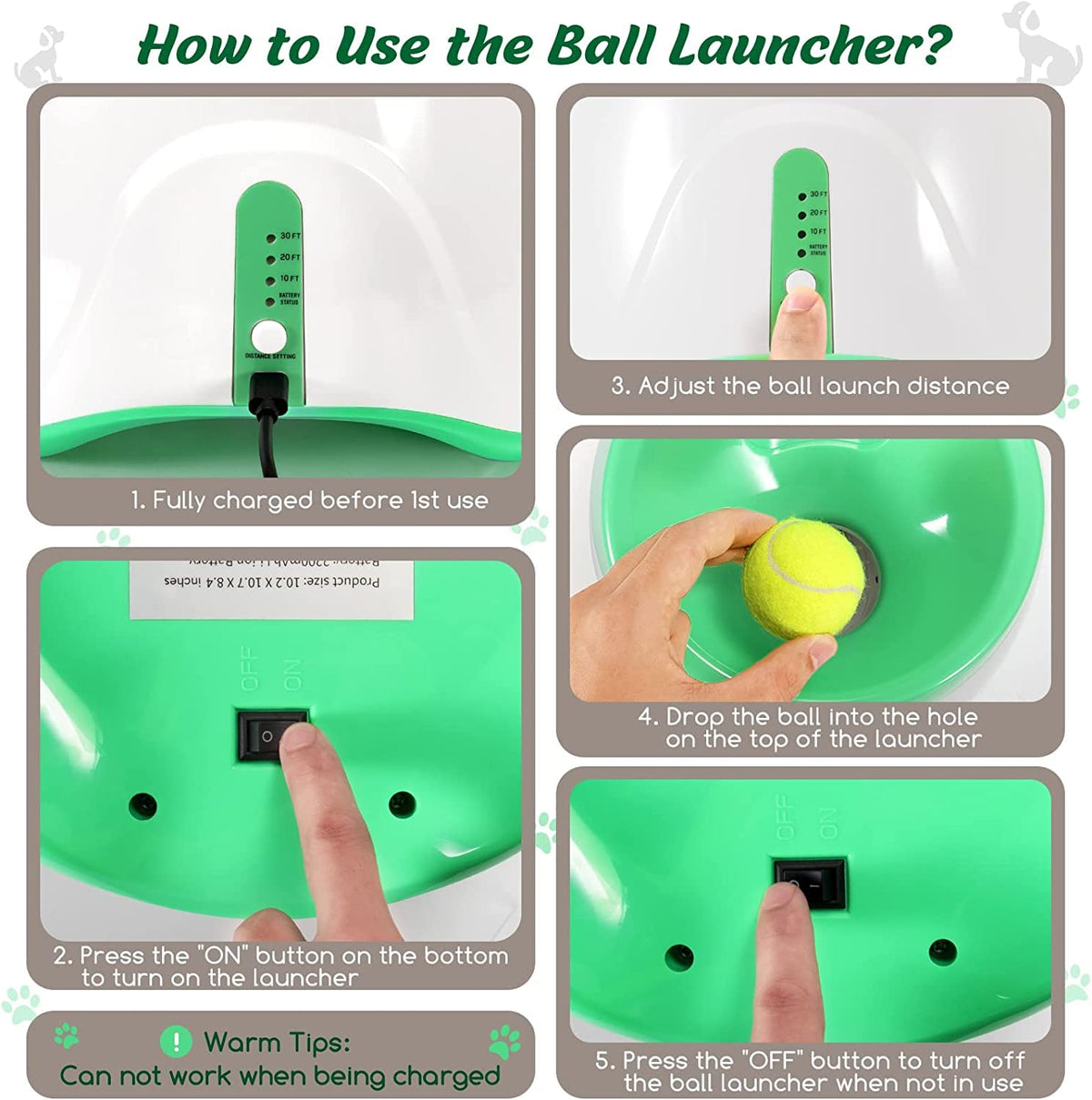 Indoor and Outdoor Use: The Six 2''Tennis Ball Included fit for small dog playing. The automatic dog ball launcher functions as perfect dogs