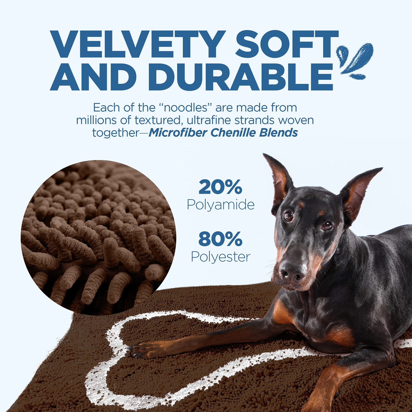 The super absorbent, Soggy Doggy Doormat absorbs more water and dirt than a typical doormat, dries faster, and remains bacteria and odor-free too. The microfiber chenille noodles are so soft and snuggly, dogs enjoy sleeping on these doormats too. They work beautifully as crate-liners and travel beds too. Perfect for the back door, back of the car, the couch, the crate, anywhere a wet dog goes, the Soggy Doggy Doormat can go too. Easy-care machine wash and dry.