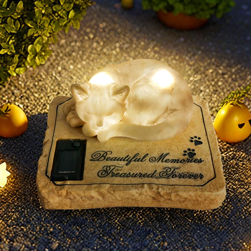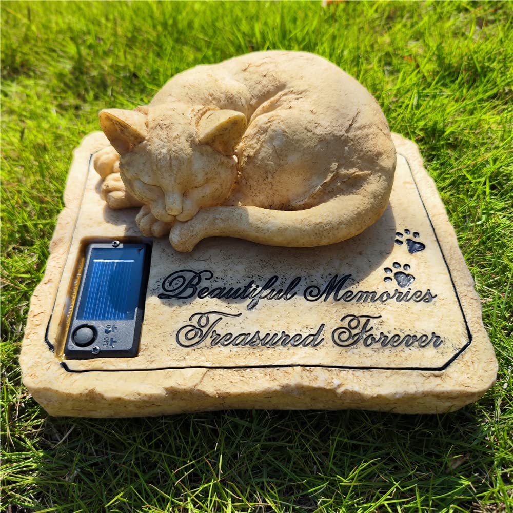 Unique Design: The cat memorial stone features with a sleeping cat statue on the top,Creative solar design, sympathy paw prints, and a touching memorial poem'Beautiful Memories,Treasured Forever.'