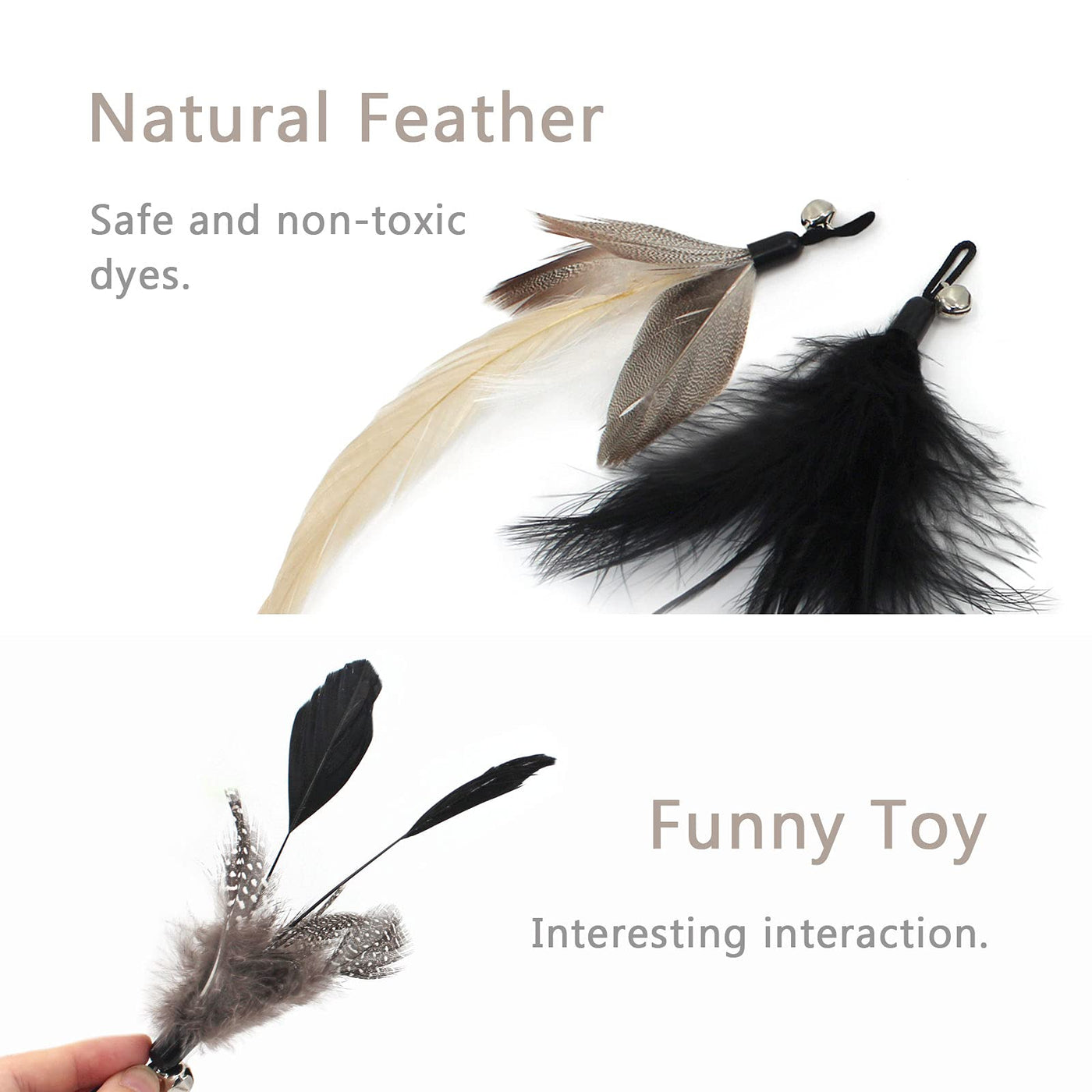 [High-quality & Non-toxic] Cat teaser toys are made of safe non-toxic and environmentally friendly materials. Our feathers are all natural and non-toxic. It is safe and pleasant for your cat. But this does not mean that they can be swallowed. Pay attention to your cat's behavior to prevent suffocation.