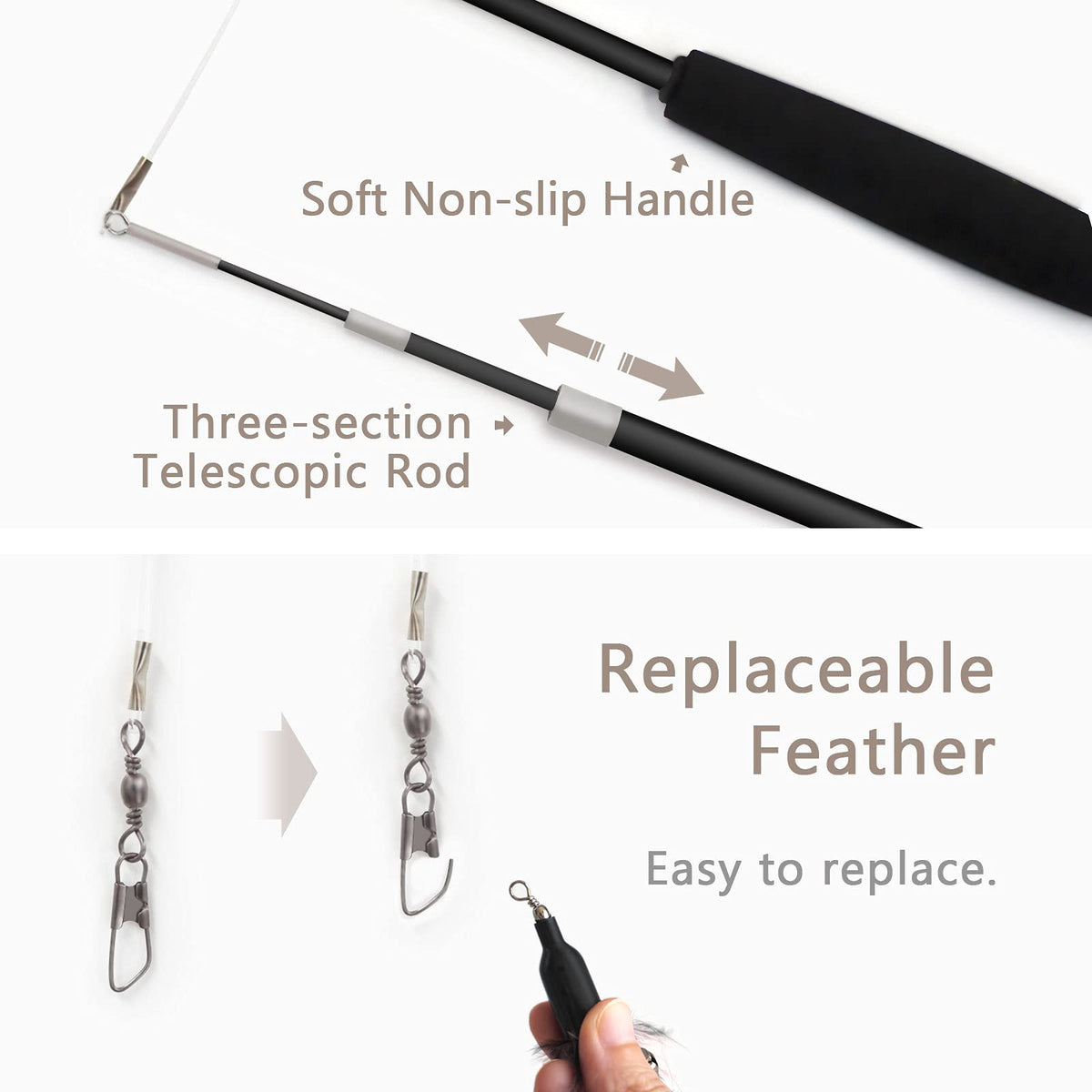 [Cat Wand Toy] The upgraded version of the wand has higher elasticity and hardness. Comes with a soft and comfortable foam handle. The pole is flexible and retractable and can be stretched from 15 to 38 inches for easy storage.