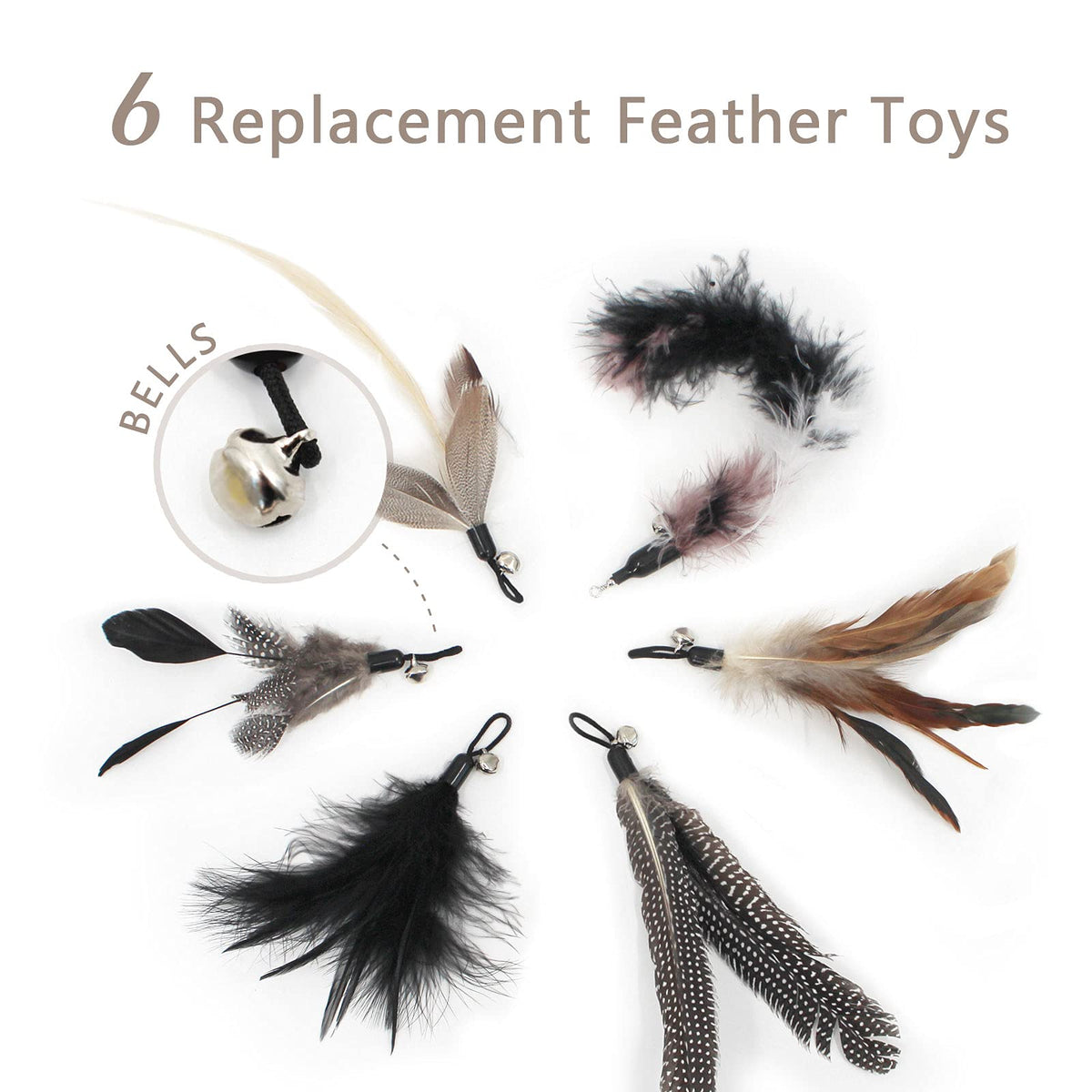 [Multiple Replaceable Feathers] 6 different replaceable feather toys easy to replace bring more choices and fun to cats. A bell of the right size can attract the cat