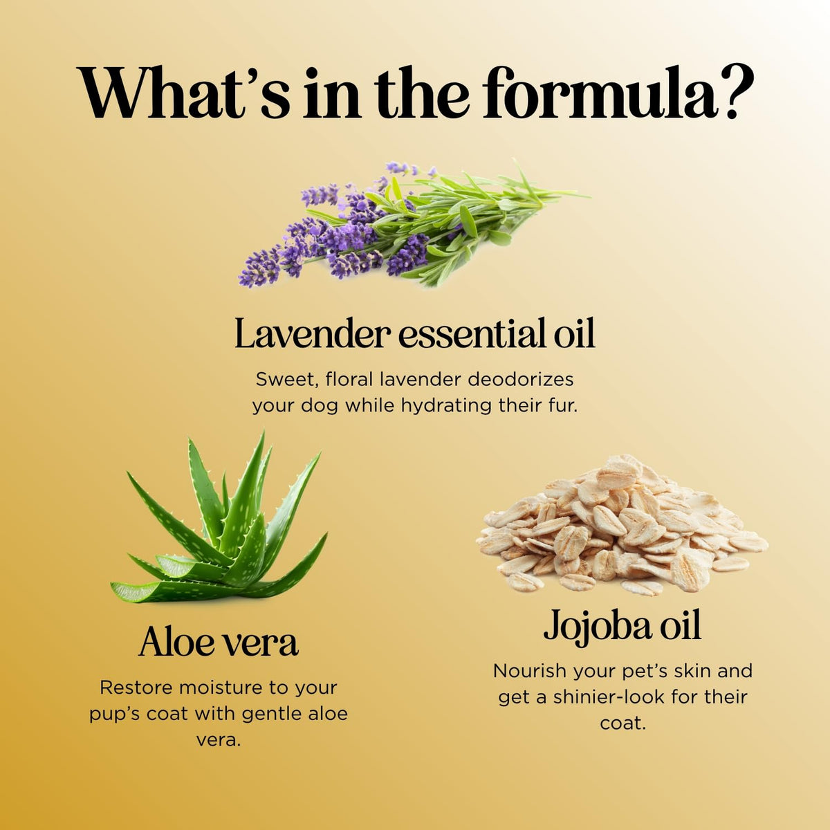 Q: What are the main ingredients in the Soothing Oatmeal Shampoo for Dogs?A: The Soothing Oatmeal Shampoo for Dogs features colloidal oatmeal, aloe, keratin, and jojoba oil. These natural ingredients work together to gently cleanse and moisturize your dog's skin and fur, making it an effective choice for all breeds and ages.