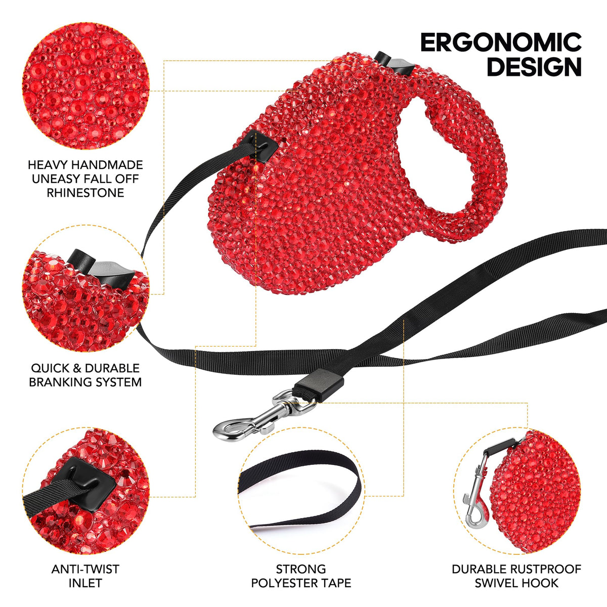 Sparkling Retractable Dog Leash,Rhinestone Pet Walking Leash For Small Dog Cat,Red Bling Small Puppy Leash,Durable 16 Ft Strong