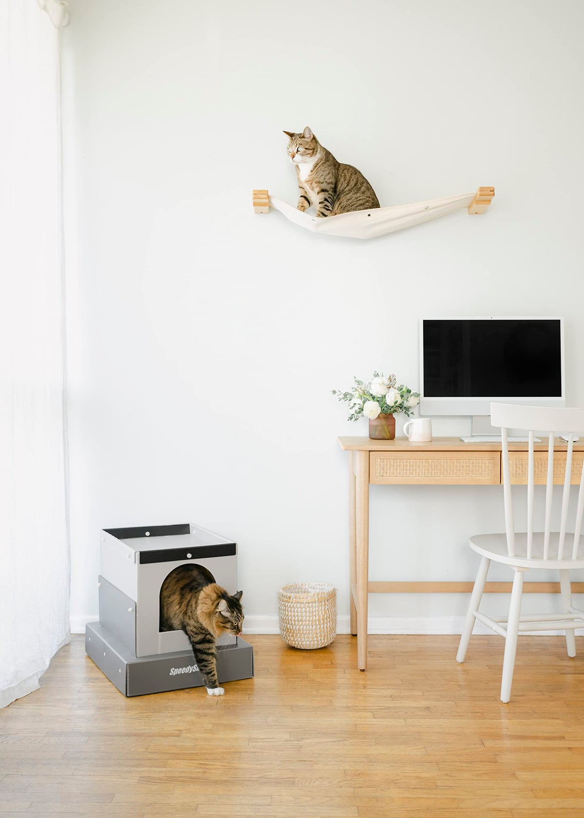 Q: What size cats is the SpeedySift Hooded Litter Box suitable for?A: The SpeedySift Hooded Litter Box is ideal for cats weighing up to 15 lbs. Its spacious design provides ample room for your feline friend to move comfortably.