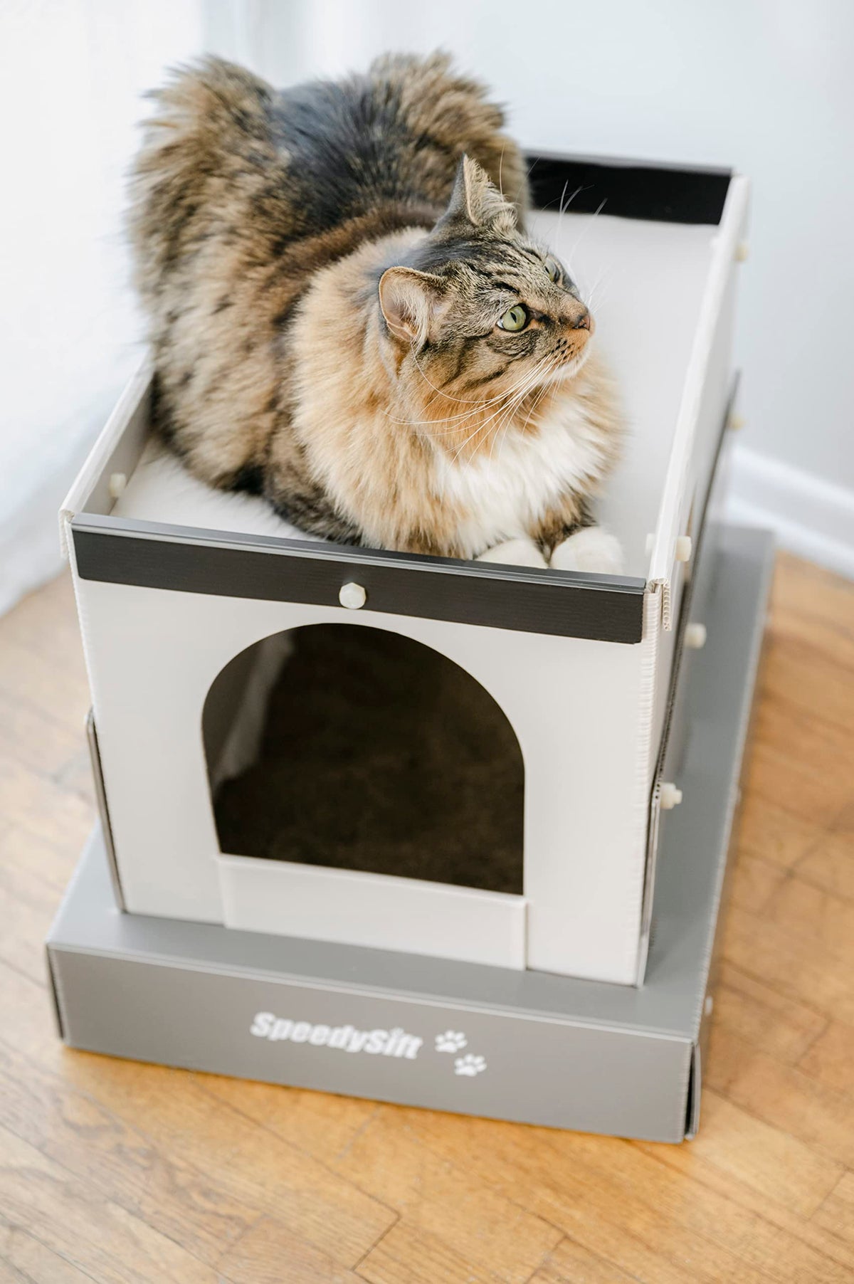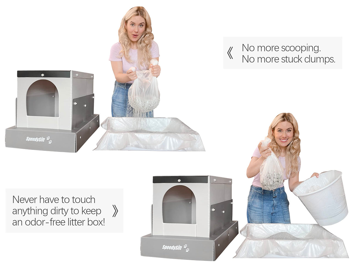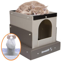 Q: How does the SpeedySift Hooded Litter Box work?A: The SpeedySift Hooded Litter Box utilizes a unique sifting system that allows you to simply lift the box, sift the litter, and toss the waste. This eliminates the need for traditional scooping, making cleaning quick and easy.