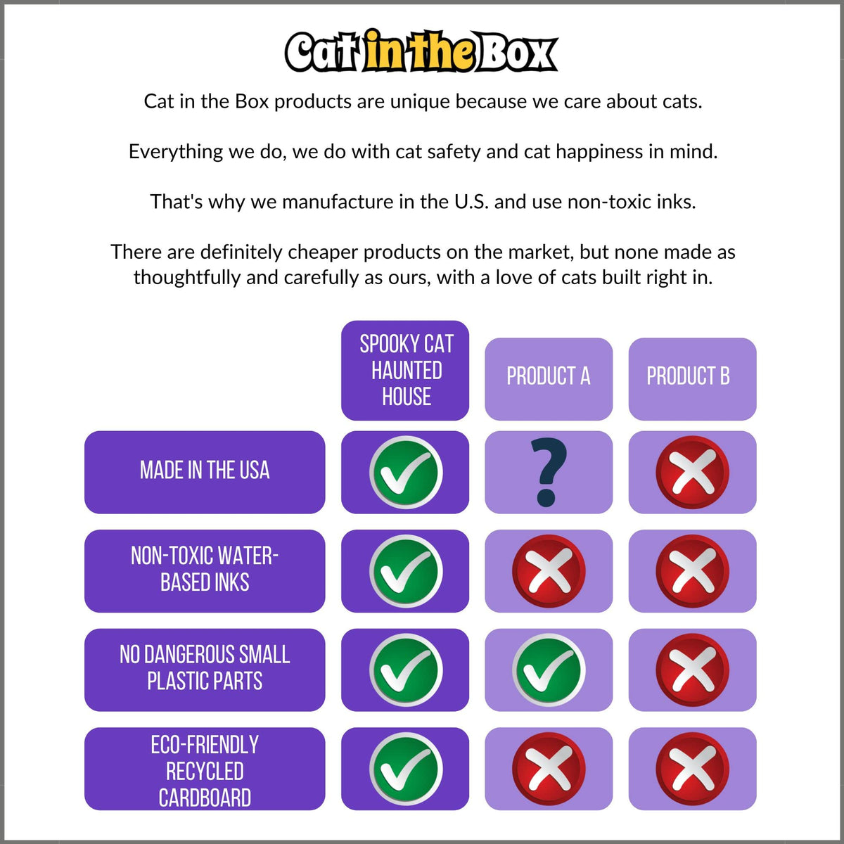 Q: What materials are used in the Spooky Cat Haunted House?A: The Spooky Cat Haunted House is made from eco-friendly recycled cardboard and printed with non-toxic water-based inks, ensuring both safety for your pets and environmental sustainability.