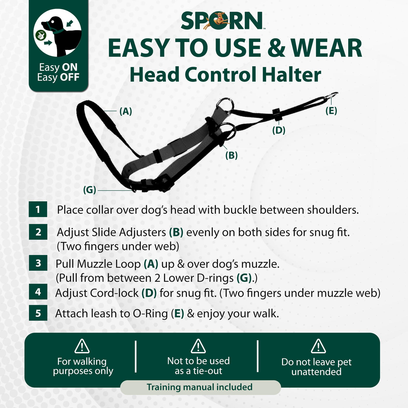 Make Your Walks More Enjoyable And Stress-Free For Both You And Your Dog. The Sporn Head Halter Is An Easy-To-Use Halter For Friendly Pull-Control That Uses Gentle Guidance From The Whithers, Not Around The Face. Designed To Immediately Stop Pulling With Its Efficient Pull Control Function. It Gently Guides Your Dogs Head And Controls Excessive Pulling, Jumping Or Barking, Ideal For Pups As Well As Aggressive Dogs. The Muzzle Strap Is Thickly Padded To Provide Maximum Comfort For Your Dog. It Converts To A Standard Collar In Seconds When The Pull-Control Function Is Not Needed. With Two Fully Adjustable Sizes, Medium And Large And Beautiful Black Color, You Will Be Sure To Find The Right Sporn Pet Halter For Your Dog!The Sporn Company Are Pioneers And Industry Leaders In Humane Dog Control Walking Solutions Technology. Collectively Our Team Has Over 100 Years Of Experience Working With Dogs. If By Some Rare Chance You Are Dissatisfied With The Product Or Performance Just Return With Proof Of Purchase. Features:1) Made With Efficient Pull Control Technology2) Padded Muzzle Strap For Optimum Comfort3) Versatile: Converts To A Standard Collar In Seconds4) Veterinary Recommended5) Doesnt Have A Typical Muzzle Look6) Easy To Put On And Removesize Guide:Medium: Suitable For 12-17 In. Neck Size And Approximately 25-60 Pounds. Fit For Cocker Spaniel, Daschund, Beagle, Border Collie And Like Breeds.Large: Suitable For 16-24 In. Neck Size And Approximately 60-130 Pounds. Fits Labradors, Boxers, Mastiff, Shephards And Like Breeds.Warning: Recommended For Walking Purposes Only. Do Not Leave The Halter On Dog Unattended. Not To Be Used As A Tie-Out.