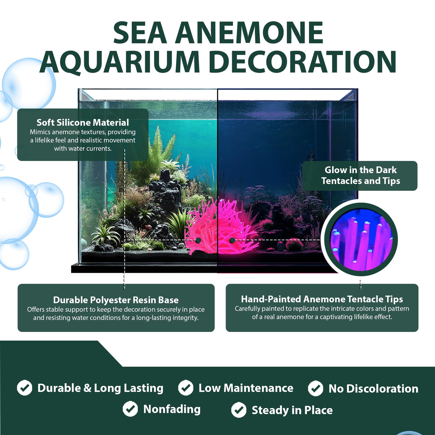 AN ANEMONE GLOW FISH TANK DECORATION THAT'S SUITABLE FOR ALL SIZES OF AQUARIUMS. Our anemone fish decorations for tank is made of 100% safe resin base and soft silicone tentacle tips that's durable and long-lasting to your aquascape home.
