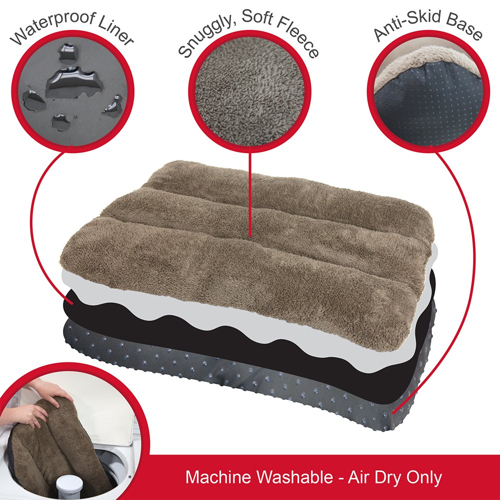 You may not let your furry sidekicks on all the furniture in the house, but they deserve to take it easy as well, right? SportPet waterproof dog beds are snuggly soft and cushioned for all day comfort, with a skid-proof and waterproof base to keep the occasional accident contained. Plus they are perfectly designed to fit inside your SportPet dog kennel (sold separately). Even better? The bed is 100% machine washable, just one more way SportPet is looking out for the pet lover’s day. Sizing note: for best fit, measure your pet in his or her favorite sleeping position, measuring from snout to base of tail. Add 6-12” to the number for the minimum length bed you’ll need. Then just consult our handy chart. Warning: do not allow children to play with or near this item. This is not a toy for children. If product becomes damaged please discard immediately. This product is designed for a specific and intended use. Do not use this product for anything other than its intended use.