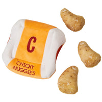 Q: Does the Cosmo Toy include any squeakers?A: Yes, each of the three chicken nuggets inside the toy contains a squeaker, providing extra excitement and engagement for your dog.