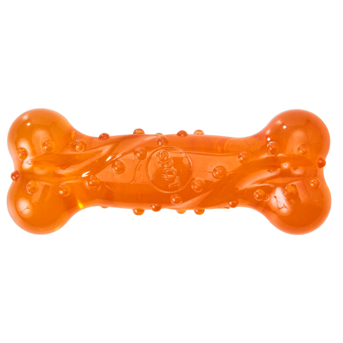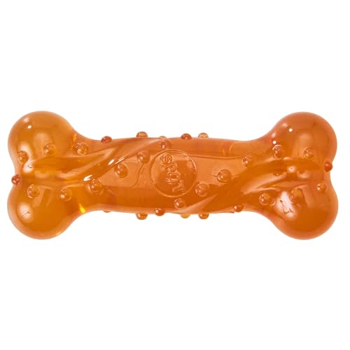 Introducing SPOT Play Strong Scent-sations aggressive chewer dog toys, crafted to captivate your furry friend's senses. With Scent-Fusion Technology, these toys blend the enticing aroma of peanut butter with the resilience of thermoplastic rubber (TPR), offering your dog an unparalleled chewing and playing experience. Designed to cater to a dog's acute sense of smell, our Scent-sations dog chew toys boast long-lasting peanut butter flavor, ensuring enduring enjoyment. Not just any chew toy, this durable rubber bone features massaging nubs that aid in dental hygiene, keeping teeth and gums clean. As one of the best options for aggressive chewers, it's an ideal choice to redirect destructive behavior and reduce stress. Whether indoors or outdoors, this versatile toy provides endless entertainment for dogs of all ages, encouraging mental stimulation and promoting a healthy lifestyle. Simply toss or throw for an exhilarating game of fetch. Suitable for dogs and puppies up to 45 pounds, each package includes one 5-inch ribbed and nubbed orange bone infused with a peanut butter flavor scent. Perfect for pit bull, bulldog, and border collie owners, these toys have no squeaker, catering to various preferences. Treat your beloved companion to the ultimate sensory adventure with SPOT Play Strong Scent-sations dog toys.