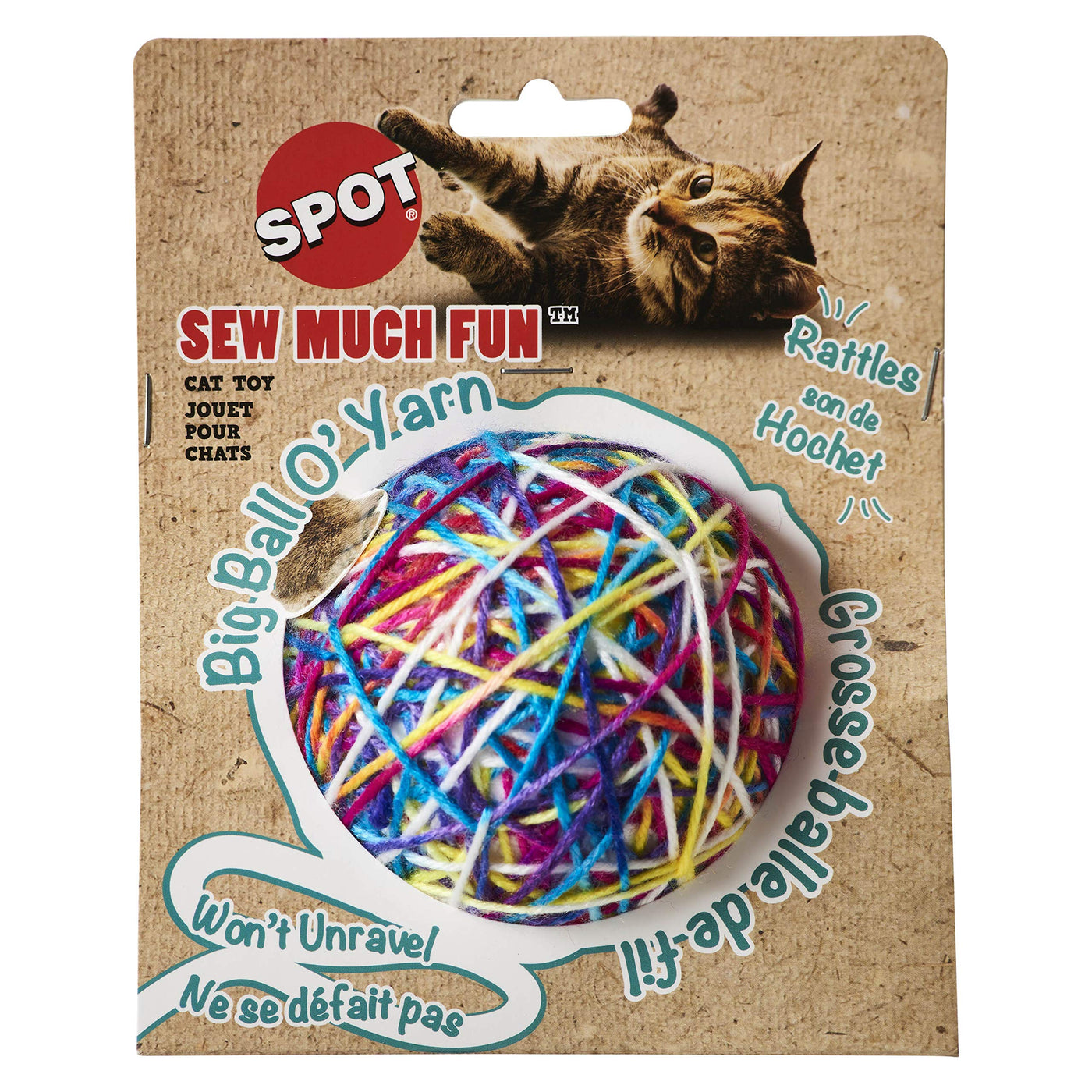 Q: What materials are used in the SPOT Sew Much Fun Yarn Ball?A: The SPOT Sew Much Fun Yarn Ball is made from a foam core wrapped securely in colorful polyester yarn, ensuring durability and safety for your cat.