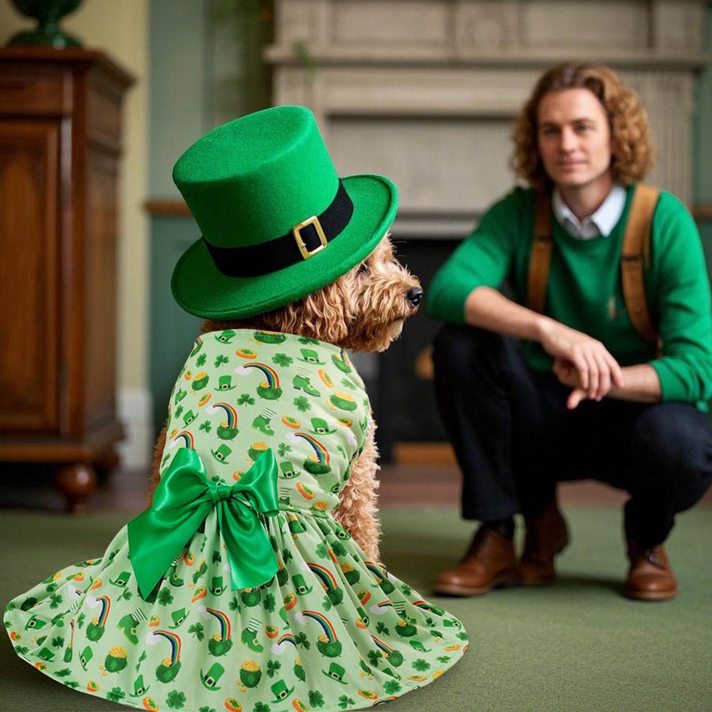 Celebrate St. Patricks Day With Your Furry Friend Dressed In This Vibrant And Festive Dog Dress. The Charming Design Features A Green Base Adorned With Rainbows, Shamrocks, And Pots Of Gold Prints, Symbolizing Luck And Happiness. Finished With A Luxurious Green Satin Bow, This Outfit Is Perfect For Creating Memorable Holiday Moments. Made From Lightweight, Breathable Fabric, This Dress Ensures Your Pets Comfort Throughout The Festivities. Available In Three Sizes (S: 6-7 Lbs, M: 8-9 Lbs, L: 11-13 Lbs), This Dress Provides A Snug Fit For Both Dogs And Cats. Whether Your Pet Is Joining A Parade, Attending A Party, Or Posing For Holiday Photos, This St. Patricks Day Dress Is Sure To Make Them Stand Out. For Any Inquiries About Sizing Or Fit, Our Customer Support Team Is Happy To Assist. Let Your Pet Shine With The Luck Of The Irish!