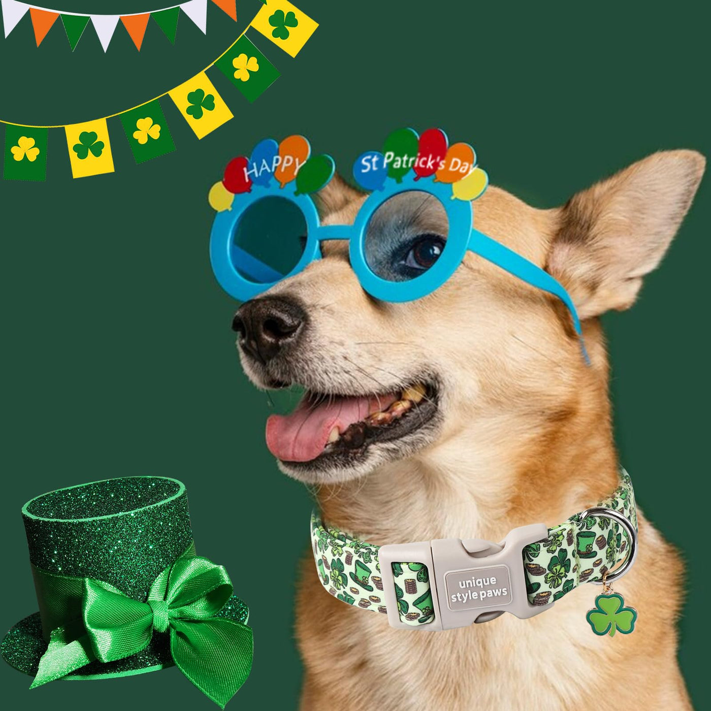 St. Patrick'S Unique Style Paws Green Trefoil Dog Collar - Shamrock Pet Collar, Adjustable Cotton With Quick Release Plastic Buc