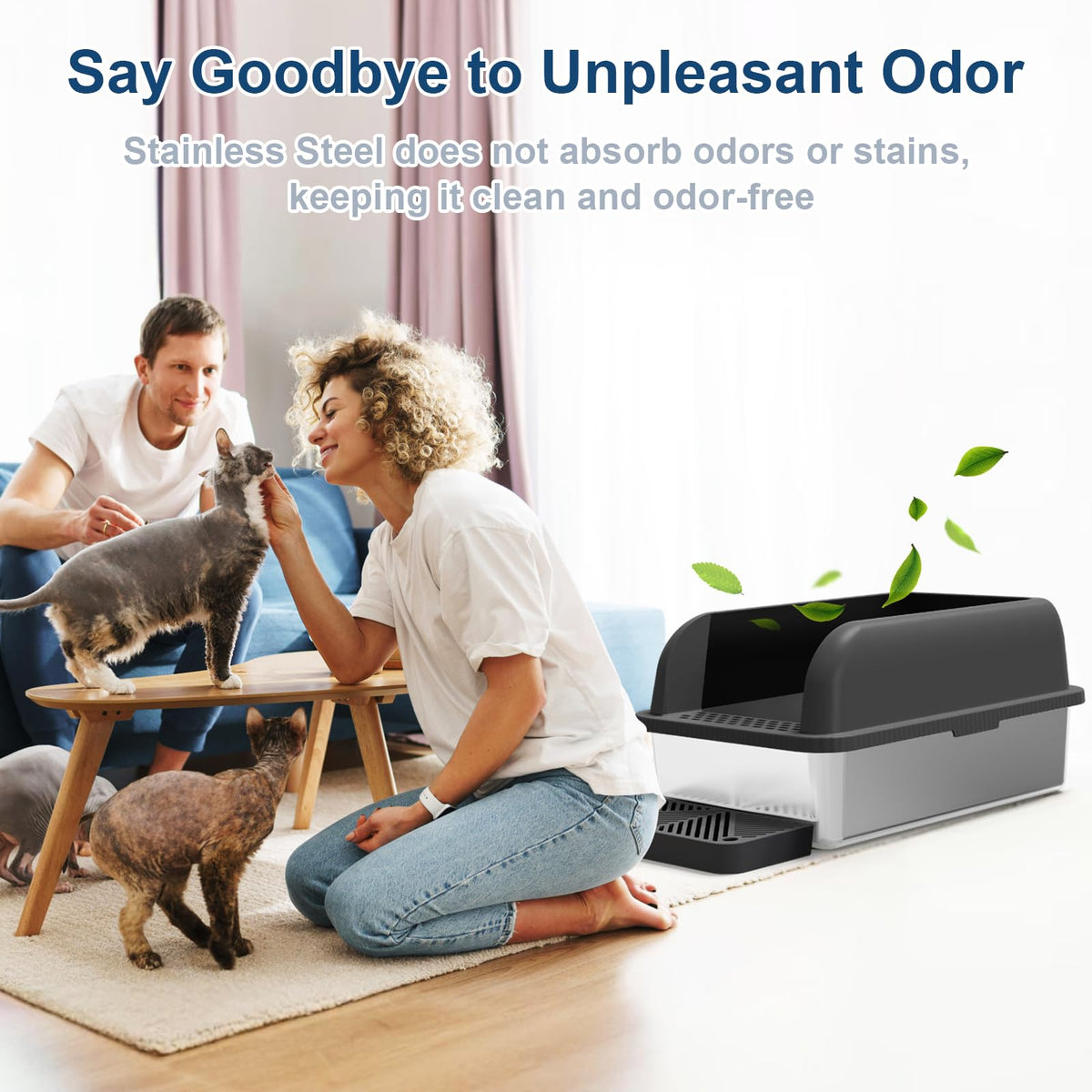 Doesn't Absorb Odor: Cleaning the high walled stainless steel litter box for cats is very easy as waste slides off the smooth and nonstick surface effortlessly leaving no lingering odors behind. Sturdy stainless steel won't get rust and scratches where odor can harbor like the plastic litter box doed creating a clean and hygienic environment for your cats