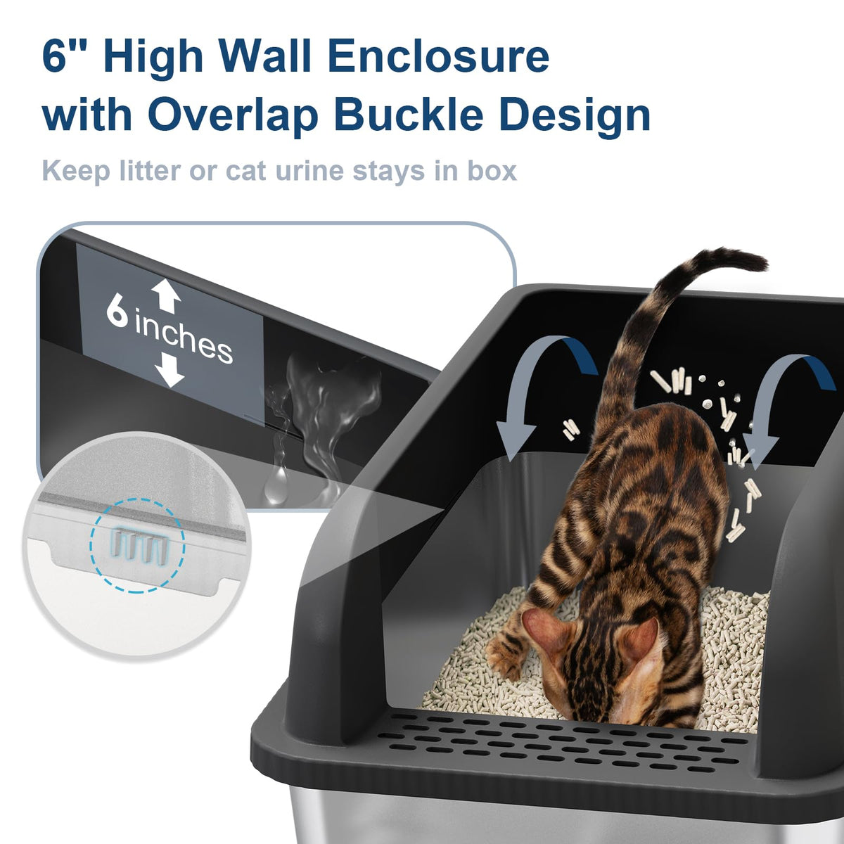 Q: Does the litter box help control odor?A: Yes, the high-walled stainless steel design prevents odor absorption, creating a hygienic environment, as the material does not rust or scratch like plastic, where odors might linger.