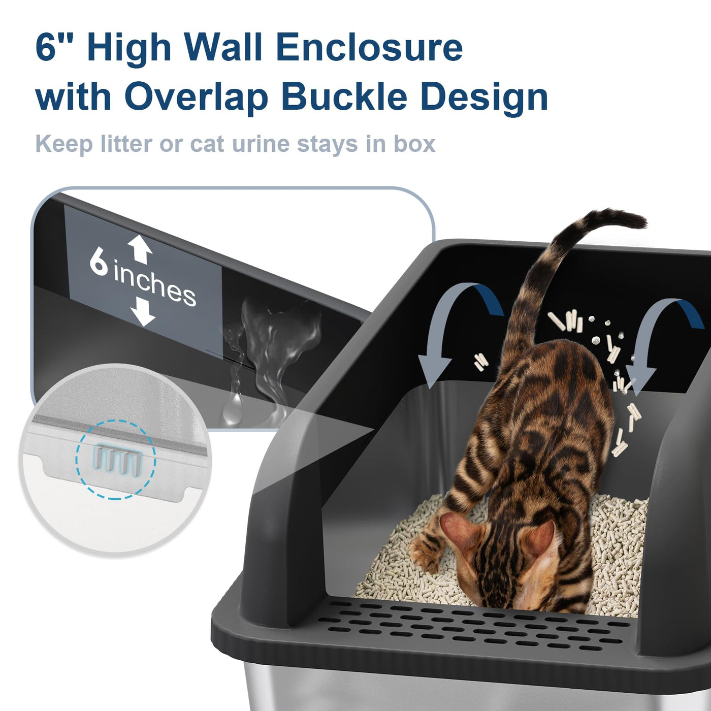 Great for High Peeing Cat: Reinforced plastic enclosure clasps firmly on the high sided stainless steel cat litter box won't be kicked off easily when your cats jump out. The overlap design keeping the urine in the box instead of seeping through the seam. No more worrying about cat urine spilling everywhere. A blessing for high pee-er