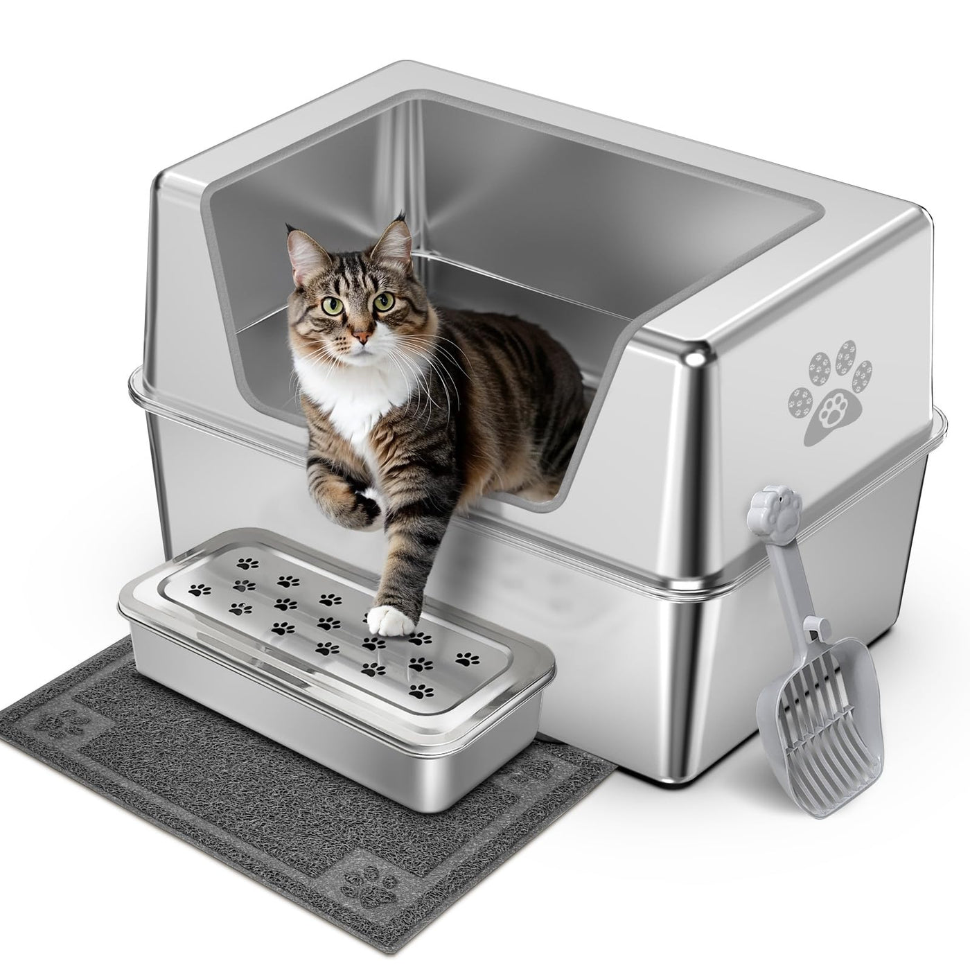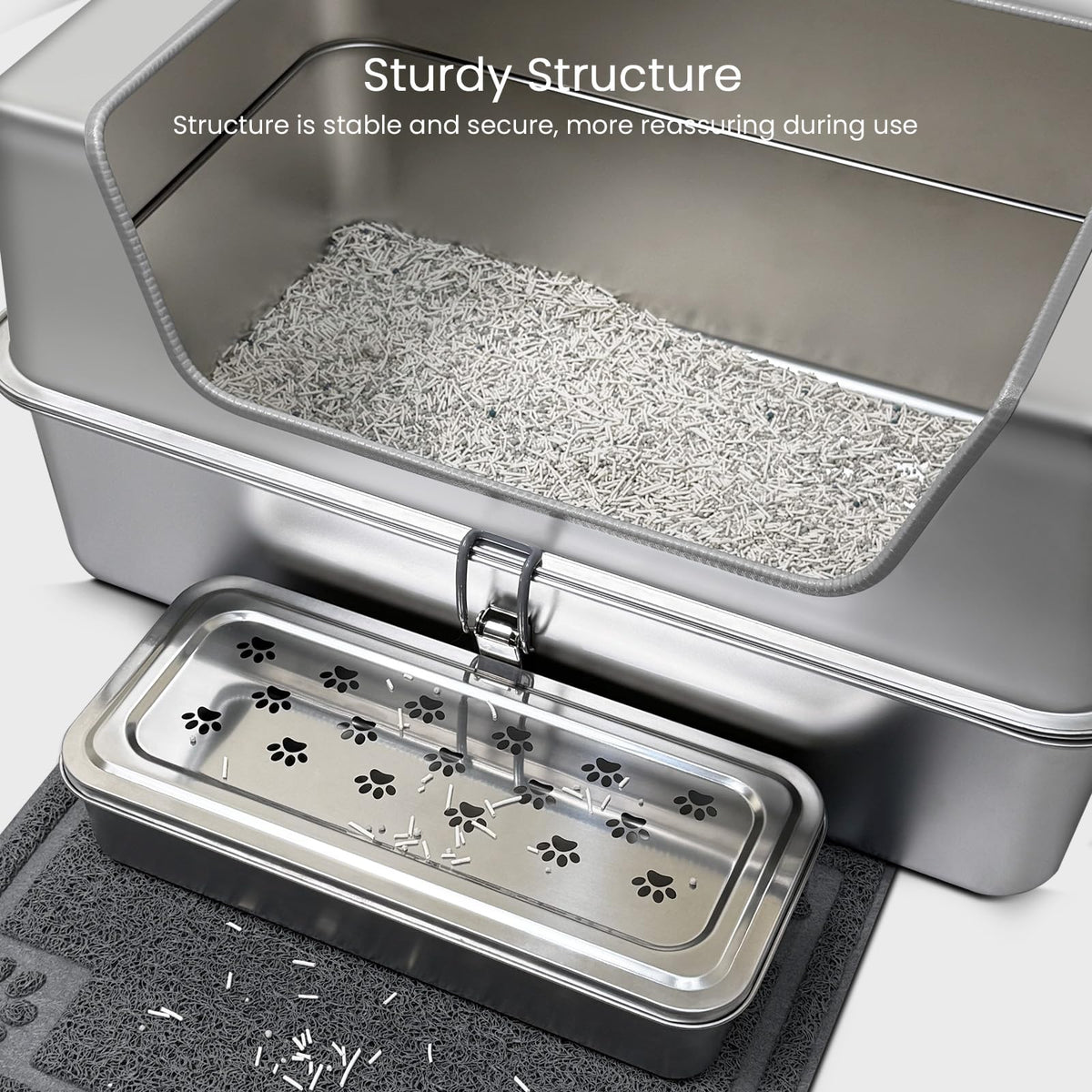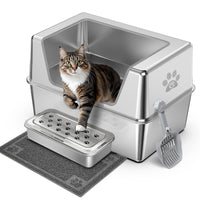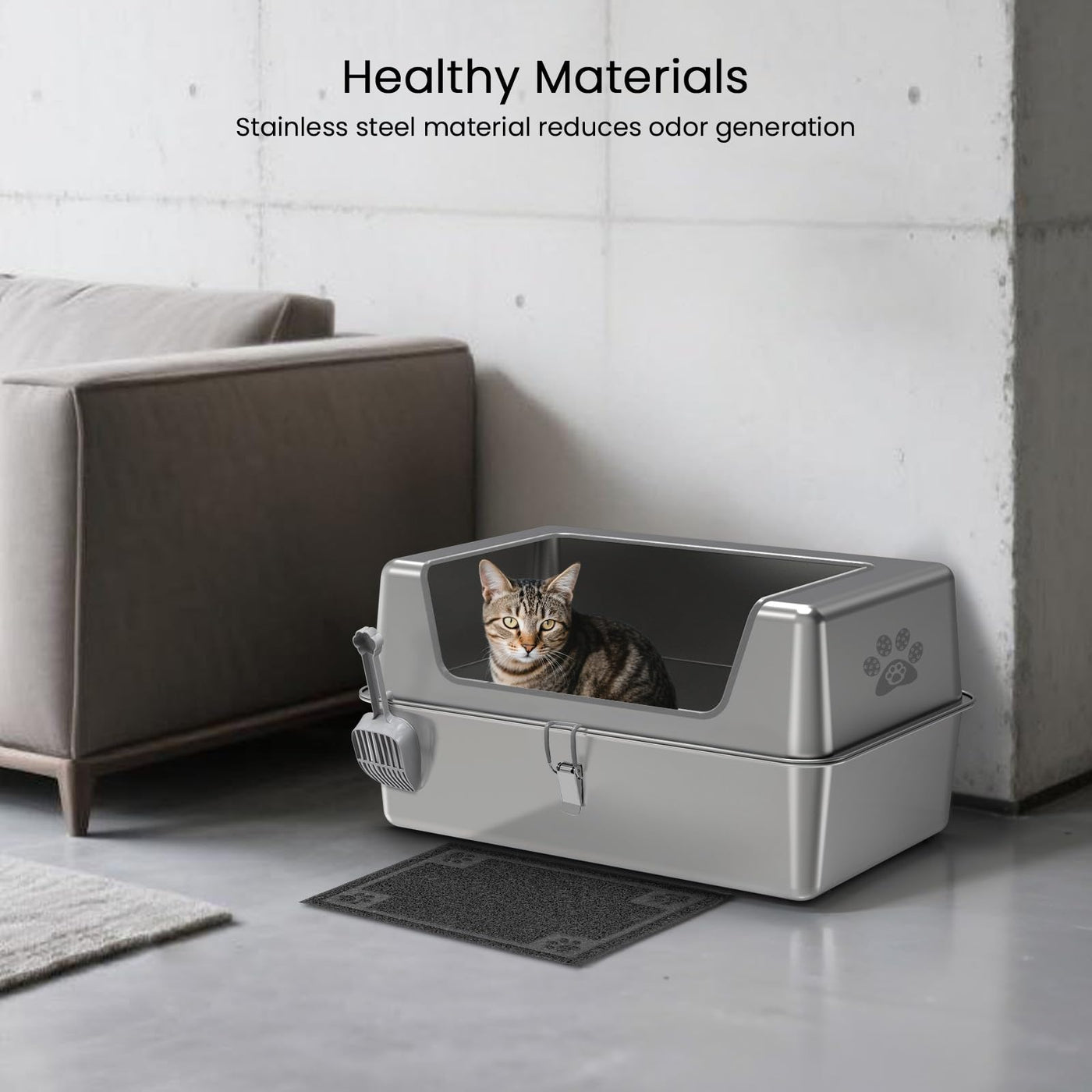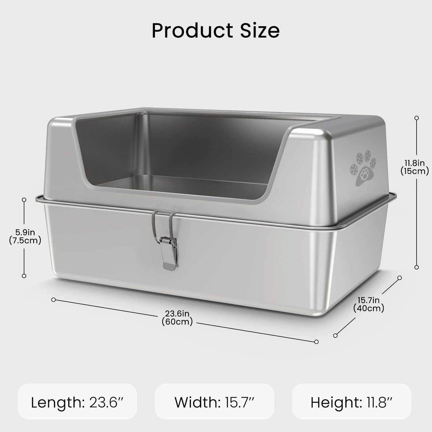 ' The Ultimate Solution For Your Pet'S Comfort And Cleanliness!Say Goodbye To Flimsy Plastic Litter Boxes And Hello To Lasting Durability With Our High-Quality 304 Stainless Steel Cat Litter Box. Designed To Withstand The Test Of Time, Its Rust-Resistant, Odor-Free, And Non-Stick, Ensuring A Clean And Elegant Solution For Your Pets Waste Management Needs. Unlike Plastic Alternatives, This Litter Box Resists Scratching And Biting, Providing You With A Reliable, Long-Term Solution That Reduces The Need For Frequent Litter Changes.Extra Large Design For Maximum Comfortwith Generous Dimensions Of 23.6'' X 15.7'' X 11.8'', This Xl-Sized Litter Box Offers Plenty Of Space For Cats, Rabbits, Hamsters, And Other Small Pets. The High Side Design Prevents Litter And Urine From Splashing Out, Making It Ideal For Multi-Pet Households Or High-Urine Cats. Let Your Pets Enjoy A Comfortable, Spacious Environment That Brings Peace Of Mind To Both You And Them.Efficient Litter Collection Systemno More Litter Scattered Across Your Home! This Stainless Steel Litter Box Comes Equipped With A Pedal, Mat, And Scoop To Help Prevent Tracking. The Stainless Steel Pedal Catches Any Stray Litter And Ensures Your Cats Paws Stay Clean While Exiting. Pair It With The Included Litter Mat To Keep Your Floors Free From Debris And Reduce Litter Waste.Open-Top Design For Better Monitoringthe Open-Top Design Allows For Excellent Ventilation, Ensuring A Fresh And Comfortable Environment For Your Pet. It Also Makes Monitoring Your Cats Health And Habits Easier Than Ever, So You Can Quickly Spot Any Potential Issues. With This Feature, Your Cat Will Have A Cleaner, More Comfortable Space To Do Their Business.Charming, Easy-To-Clean &Amp; Convenientadd A Little Cuteness To Your Home With The Adorable Cat Paw Prints On Each Side Of The Box ''