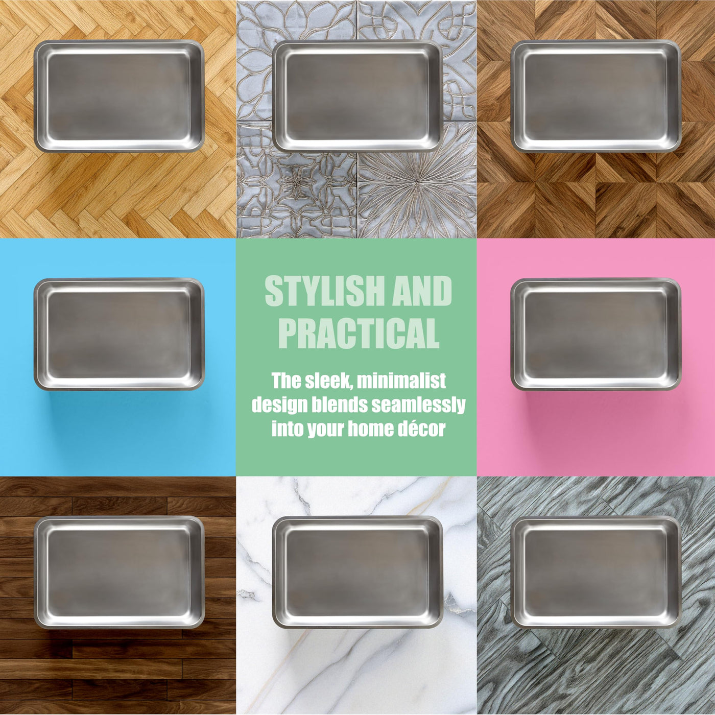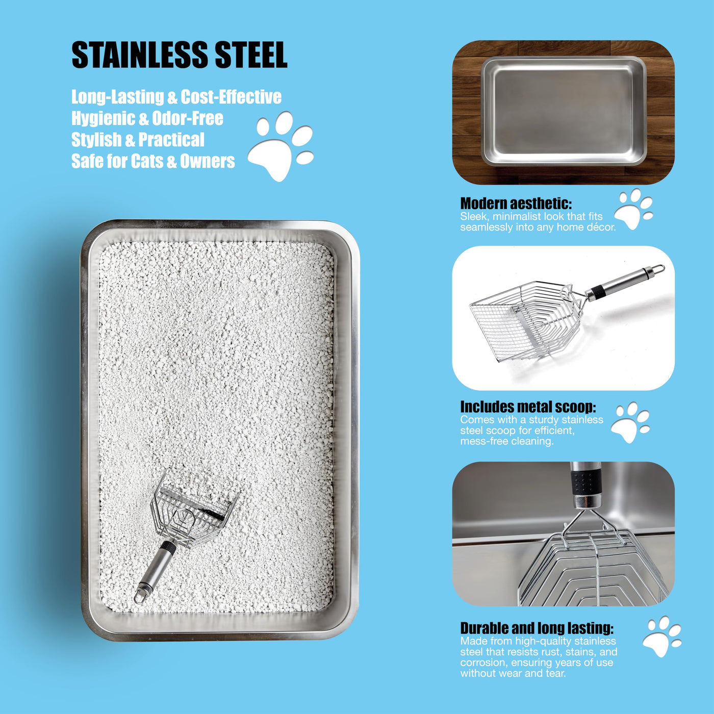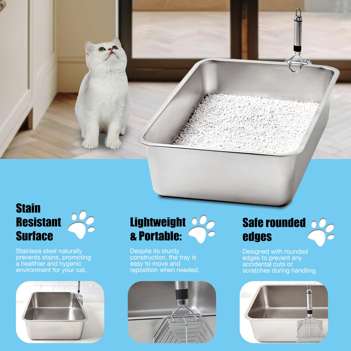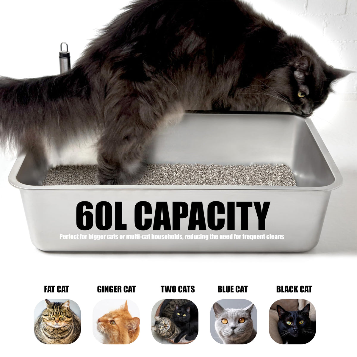 The Ultimate Stainless Steel Cat Litter Box - Hygienic, Durable, And Odor-Resistant! Say Goodbye To Smelly, Stained Plastic Litter Boxes! Upgrade Your Cats Litter Experience With Our Premium Stainless Steel Litter Box, Designed For Ultimate Cleanliness, Durability, And Convenience. - Rust-Proof & Stain-Resistant - Made From High-Quality Stainless Steel, This Litter Box Wont Absorb Odors, Stain, Or Develop Scratches Like Plastic Alternatives. It Stays Fresh And Clean For Years To Come! - Easy To Clean, Hassle-Free Maintenance - No More Scrubbing Or Lingering Odors! The Non-Stick Surface And Seamless Design Make Scooping And Washing A Breeze. Just Wipe Or Rinse, And You'Re Done! - Spacious & Comfortable For Your Cat - With A Generous Interior, This Litter Box Gives Your Feline Plenty Of Space To Do Their Business Comfortably, Making It Perfect For Cats Of All Sizes, Including Large Breeds. - High-Walled Sides For Less Mess - Keep Litter Scatter And Urine Spray Contained! The Tall, Reinforced Sides Prevent Spills, Keeping Your Floors Cleaner. - Sleek, Modern Design - Unlike Bulky Plastic Trays, This Minimalist, Silver-Finished Litter Box Blends Seamlessly Into Any Home D Cor. Who Knew A Litter Box Could Look This Stylish?