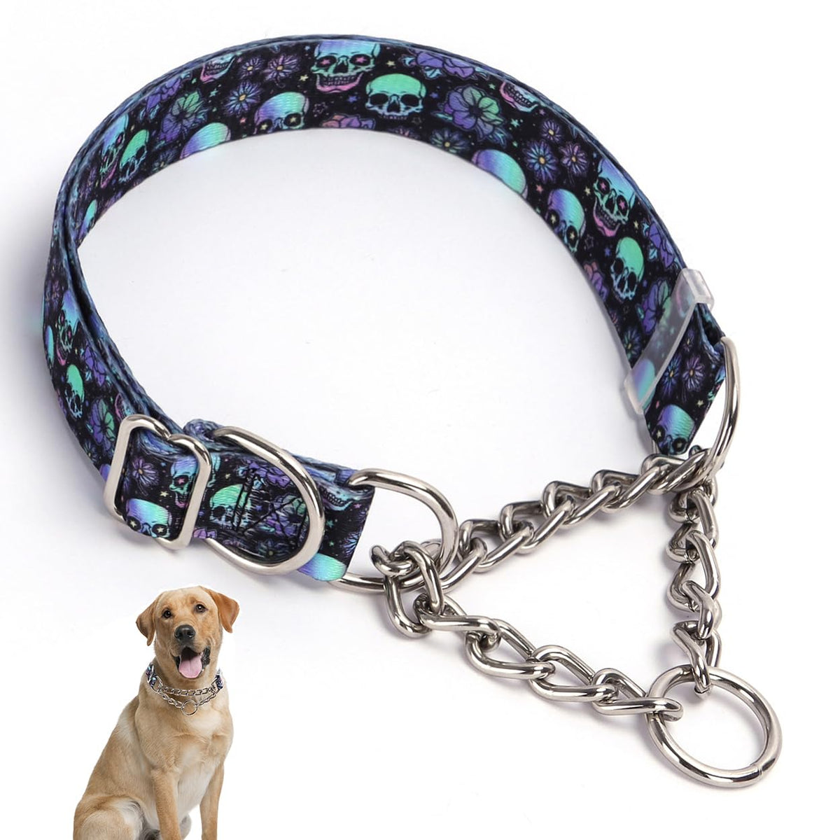 Stainless Steel Chain Martingale Collar For Dogs, No Pull Slip Cinch Choker Choke Collar Training Escape Proof Heavy Duty Dog Collar For Small Medium Large Pet Girl Female Dogs?Sizes For Medium & Large Breed Dogs? This No Slip Collar For Dogs Is Available In: S For Neck 11-16 Inch, Width 1-Inch.M For Neck 15-20 Inch, Width 1-Inch. L For Neck 19-24 Inch, Width 1-Inch. Xl For Neck 22-28 Inch, Width 1-Inch. Measure Around The Neck Where The Collar Would Comfortably Lay And Refer To The Sizing Picture. ?Positive Training For Lifetime Bonding? Our Martingale Dog Collar Is A Limited Slip Design For A More Gentle Correction With An Audible Cue That Tightens Evenly Around The Neck To Make Training With Your Dog Safe And Effective. ?Durable - Chain Upgrade? Our No Pull Dog Collar Is Constructed With Stainless Steel Chain And The Cinch Collar Will Never Rust Or Stain Your Dogs Fur. The Steel Chain Also Creates An Audible Training Cue To Further Reinforce Your Training. ?Safe, Effective Training?A Traditional Choke Collar For Dogs Is Aggressive And Uses Uncontrolled Force To Correct Negative Behaviors - This Collar Tightens Under Tension But Only Enough To Provide A Gentle, Controlled Training Cue To Your Dog. When Your Dog Pulls, The Chain Provides An Audible Sound, Enhancing Training. Properly Fitted, The Collar Will Be Comfortably Loose When Your Dog Is Not Pulling On The Leash. ?Nice Design? Our Chain Martingale Collars Dont Just Perform Well, They Look The Part Too. With A Number Of Colors And Patterns Available You Can Choose Your Pups Favorite, And Then Complete The Set! Matching Leashes, Harnesses And Other Accessories Are Available So Your Pet Will Be The Most Stylish At The Park! Includes: 1 X Martingale Collar For Dogs Chain