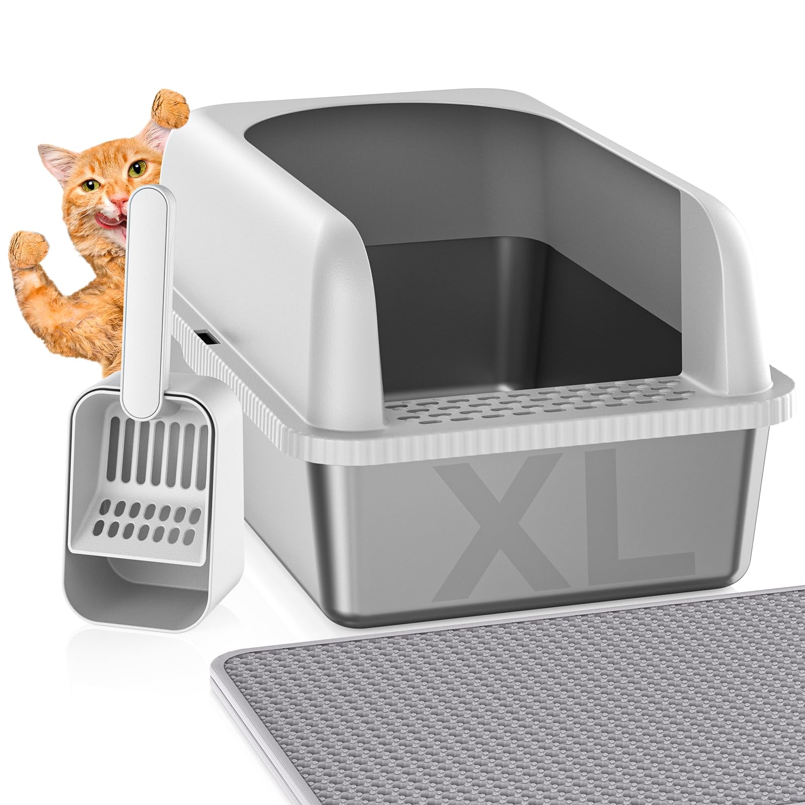 Leak-proof latching cover: Stainless steel litter box upgrade reinforced the latch installation of the lid so that the top cover and stainless steel litter box connection more stable do not worry about the cat jumping out of the top cover will fall off. The 6-inch high side and stainless steel litter box overlap to prevent urine leakage suitable for high urine cats retain the urine in the litter box but also prevent the cat from digging sand splash solve the problem of cat urine leakage and sand splash keep the floor clean and dry odor free | Easy to clean and odor-free: The smooth material of this stainless steel cat litter box makes it easier to slip away litter and dump it without residue! The large stainless steel litter box with lid only needs to be washed with water and wiped easily it will be a new look and will not absorb cat urine and other odors the litter box shell and open top are semi-closed design easy to circulate air keep the smell of the litter box fresh no longer worry about bad smells enjoy fresh air anytime and anywhere | Oversized stainless steel litter box: Measuring 24 x 16 x 12 inches our stainless steel litter box is spacious enough for cats of all sizes to move around flexibly inside and high side walls to provide more privacy and security for cats. Our large litter box has a capacity of 28 L enough for an adult cat for 30 days reducing the frequency of litter changes which means you can go to work or travel without worrying about changing the litter you are not only choosing our litter box but also your precious time | High quality stainless steel material: This stainless steel rust-proof and scratchproof litter box is made of thickened high quality stainless steel to ensure durability for 3-5 years stainless steel litter box with rounded edges design easy to hold will not hurt your skin or pets compared to plastic litter box our stainless steel litter box surface non-stick scratch resistant easy to clean durable can accompany your pets grow up | Value package: You will get stainless steel cat litter box x1 Plastic high side lid x1 Plastic cat litter scoop x1 Double cat litter mat x1 English instruction manual x1. Independent storage of cat litter spoon place hygienic and convenient; Double litter mat When the cat jumps to play will store stray cat litter keep the floor clean and tidy at the same time double litter mat design will help you save cat litter