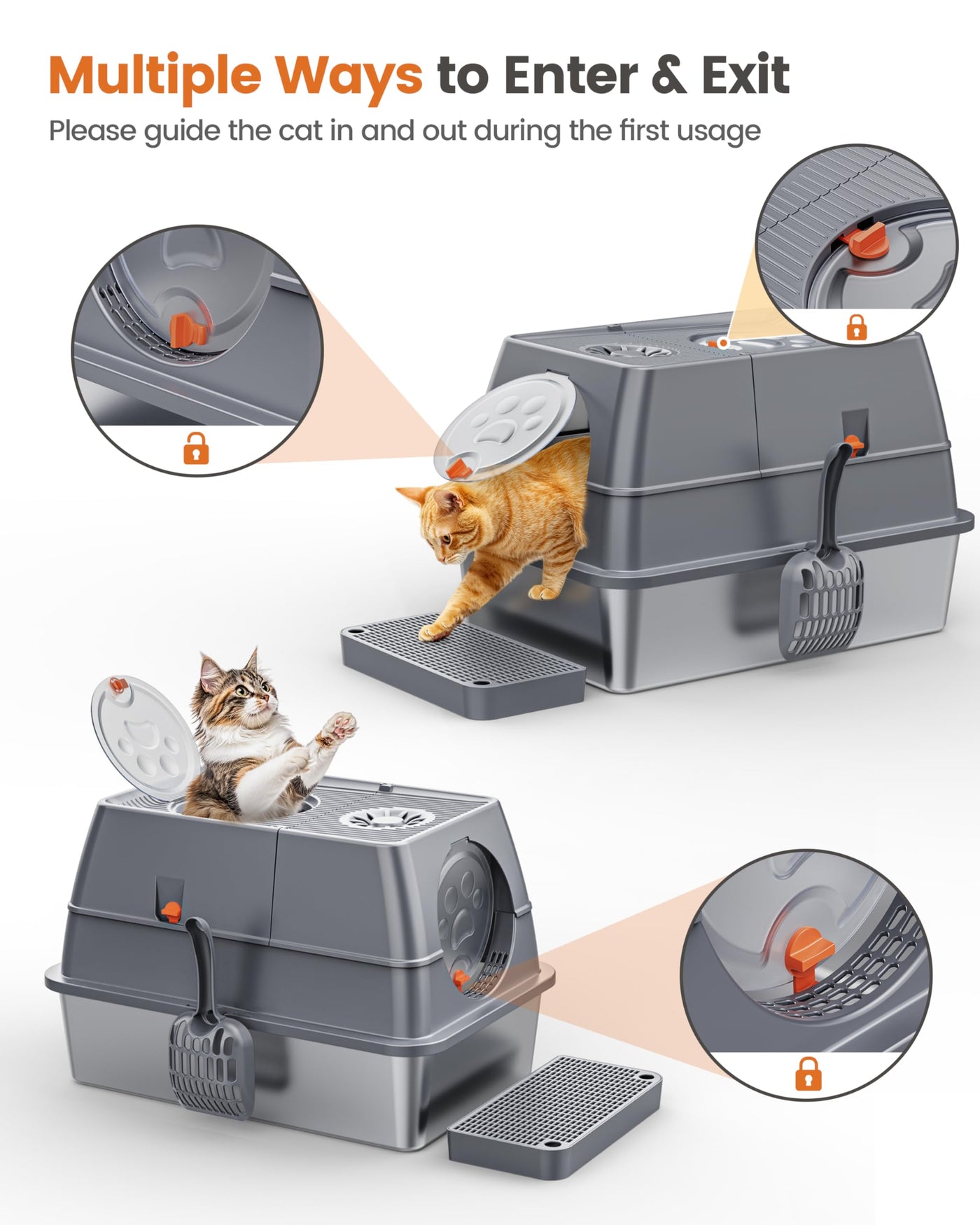 Stainless Steel Litter Box with Lid XL Large Enclosed High Sided Covered Metal Steel Cat Litter Box with Steps Scoop, Easy Clean