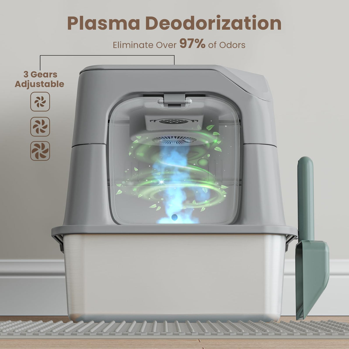 Stainless Steel Litter Box With Odor Removal Smart,Large Cat Litter Box With Lid 23.7''*16.1''*16.8'' Covered Metal Litter Tray