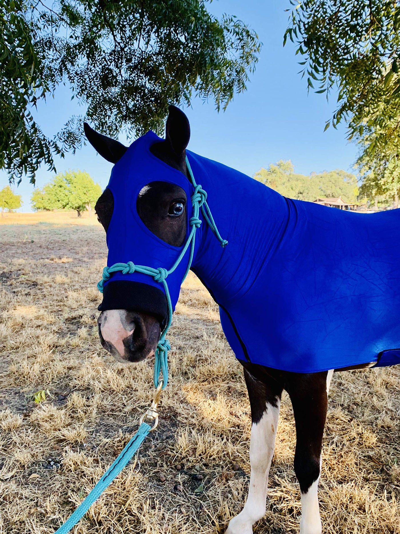 Introducing Star Point Mini Horse Body Suits! Made from high quality material, the suit comes with a zipper neck and zipper end guard with hook and loop under the horses chin to prevent broken zippers when the horse rubs. The eye holes are larger than average making it more comfortable for your Mini to wear for long periods of time. The nose piece has soft fleece that prevents tears. There are two heavy duty hook and loop straps, one under the belly and one across the hindquarters under the horses tail to secure the body suit. The suit is equipped with a removable tail bag. Enjoy the comfort, quality and fun colors and be ready for horse show season/events!