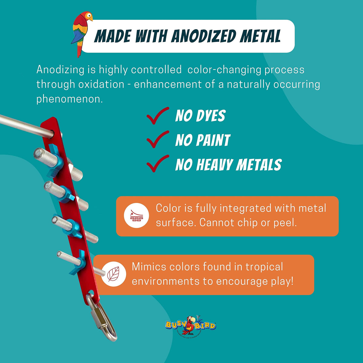 Busy Birds Mechanical / Foraging Parrot Toys Are Built To Last For The Life Of Your Bird. Constructed Of Solid Anodized Aluminum And Some Stainless Steel, Our Toys Are Safe, Durable And Lightweight. They Are Chemical And Dishwasher Safe- The Colors Wont Wash Away Or Fade. All Toys With Wing Nuts And Hex Nuts Are Hassle-Free, As They Won'T Come Off Their Bolts. The Thread At The End Of The Bolts Are Altered, So Your Feathered Friend Cant Get Them Off And You Dont Have To Forage Around The Floor Of The Cage To Find Them. Your Bird Will Love It!