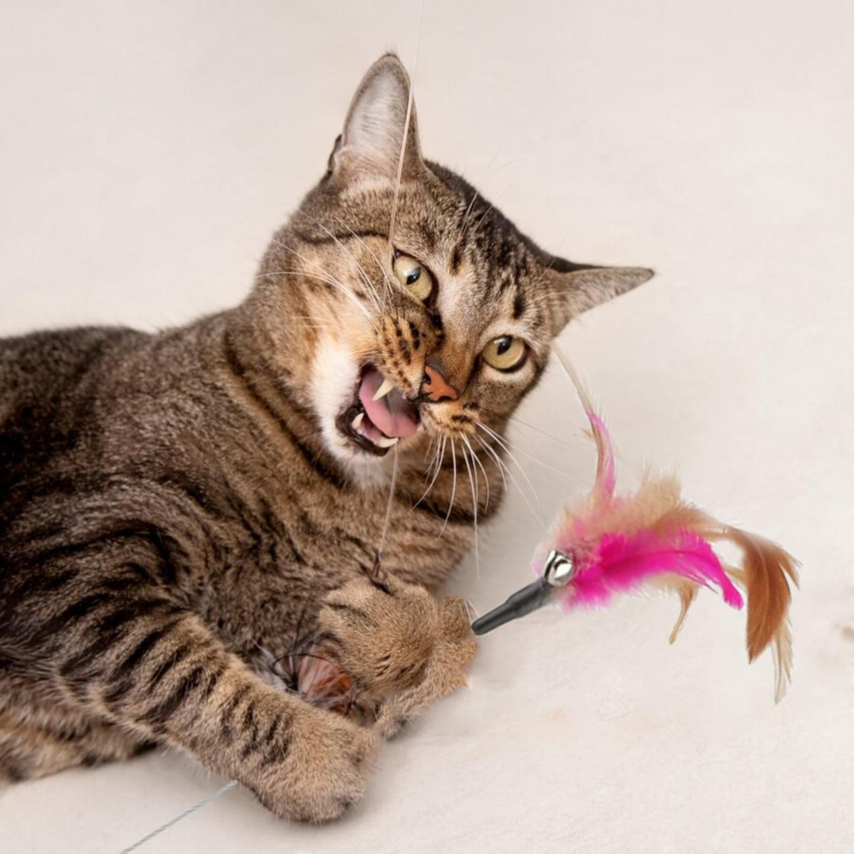 Feature: Made Of Natural Rubber And Feather,Colorful Material:Rubber And Feather Color:As Showed In Picture Product Size:As Showed In Picture Product Weight: 3.8 Ounces Note: Away From Fire Package Include: 3*Cat Teasing Toys, 6*Replacement Feathers