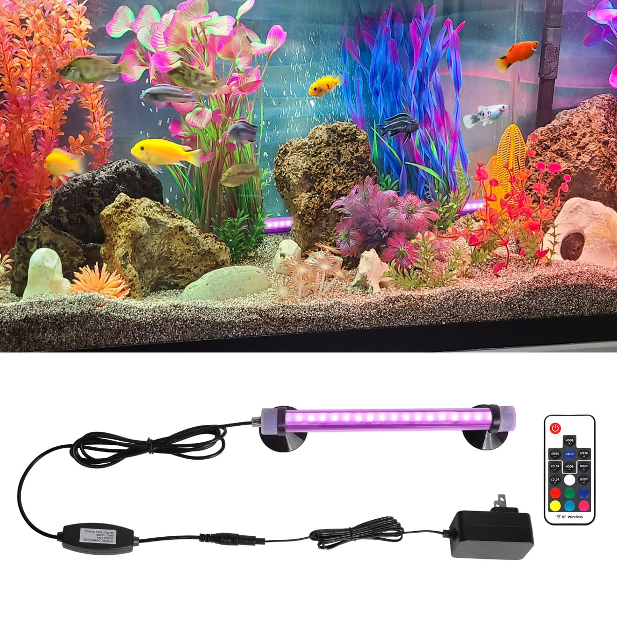 LED Illumination: Featuring energy-efficient LED lighting technology, this aquarium light kit provides vibrant blue illumination for your fish tank. Remote Control: Conveniently adjust the lighting settings with the included remote control, allowing you to create the perfect ambiance.This remote has a memory function. Versatile Compatibility: Designed to fit a wide range of aquarium sizes, this lighting kit offers a universal solution for your underwater ecosystem. Easy Installation: With a straightforward setup process, you can effortlessly enhance the visual appeal of your aquarium. Durable Construction: Crafted with high-quality materials, this aquarium light kit ensures long-lasting performance and reliability.