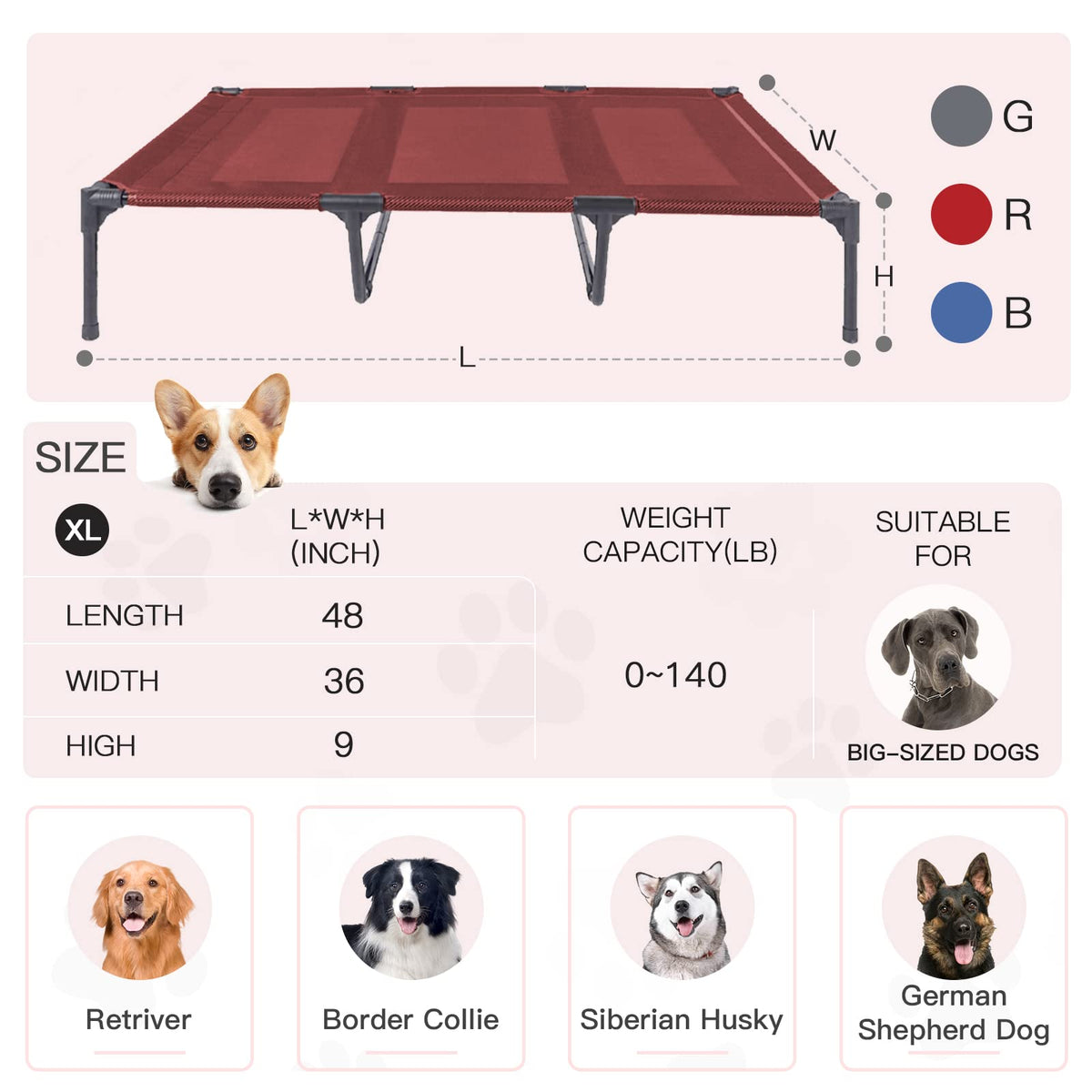 Q: What sizes are available for the SUDDUS dog bed?A: The SUDDUS elevated dog bed is available in multiple sizes, including XL (48*36*9 inches), to accommodate dogs of various breeds and sizes. Be sure to check the size chart to find the best fit for your furry friend.