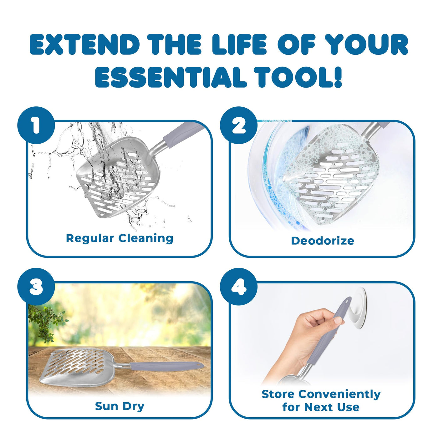Clearing the litter box is an unappreciated and unpleasant job. But keeping a clear box not only decreases litter box issues, it also gives you a chance to monitor your kitty’s health and keep your home fragrant. SunGrow’s Large Cat Liter Scoop is the best choice for your home. Our scoop works with all of today’s litter options. It's durable, has a comfortable grip handle, a deep scoop designed for square and round pans, and odors and clumps won’t stick to it. Also, the universal Grey-colored handle goes with every kind of home decor. So, choose SunGrow’s for your home.