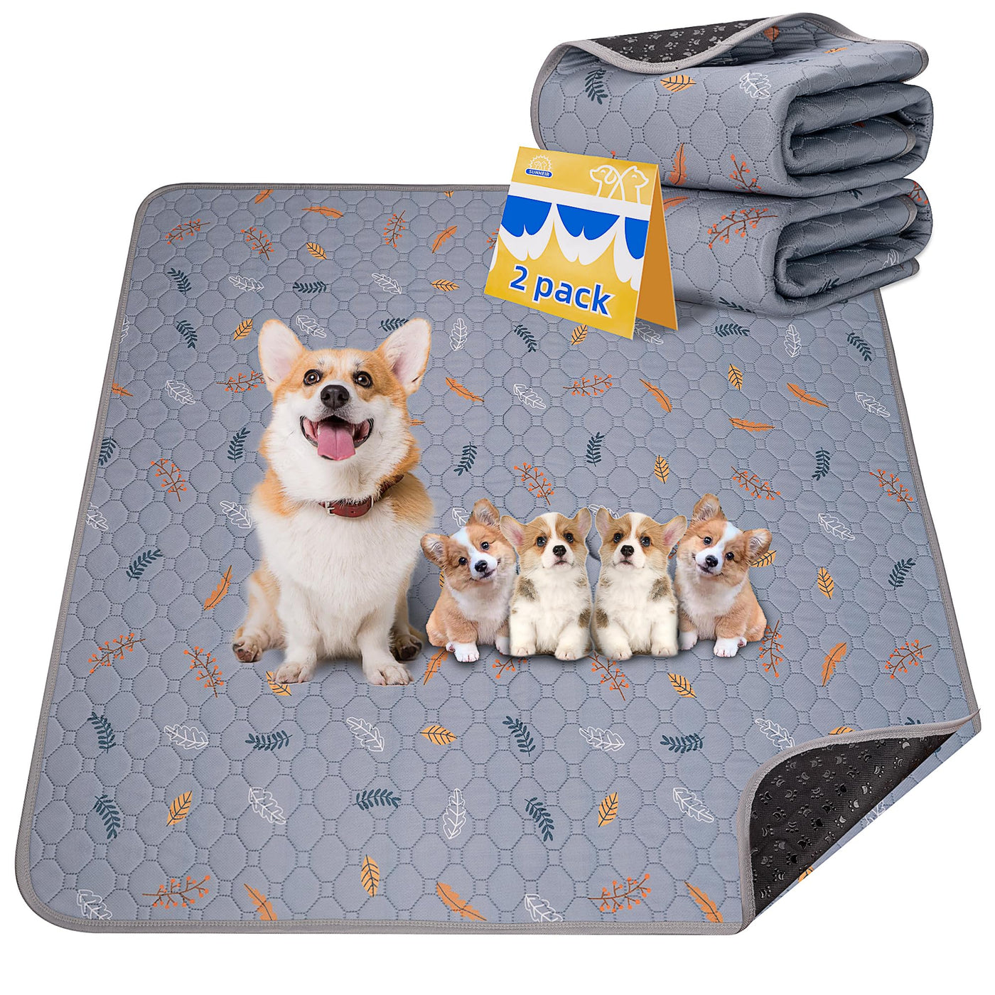 Sunheir Washable Pee Pads For Dogs 2-Pack Reusable Puppy Pads Pet Training Pads, Waterproof Dog Pee Pads For Crate, Whelping Pad, Non-Slip Protects Against Urine Leakage (Leaves - Light Grey, 31X36)