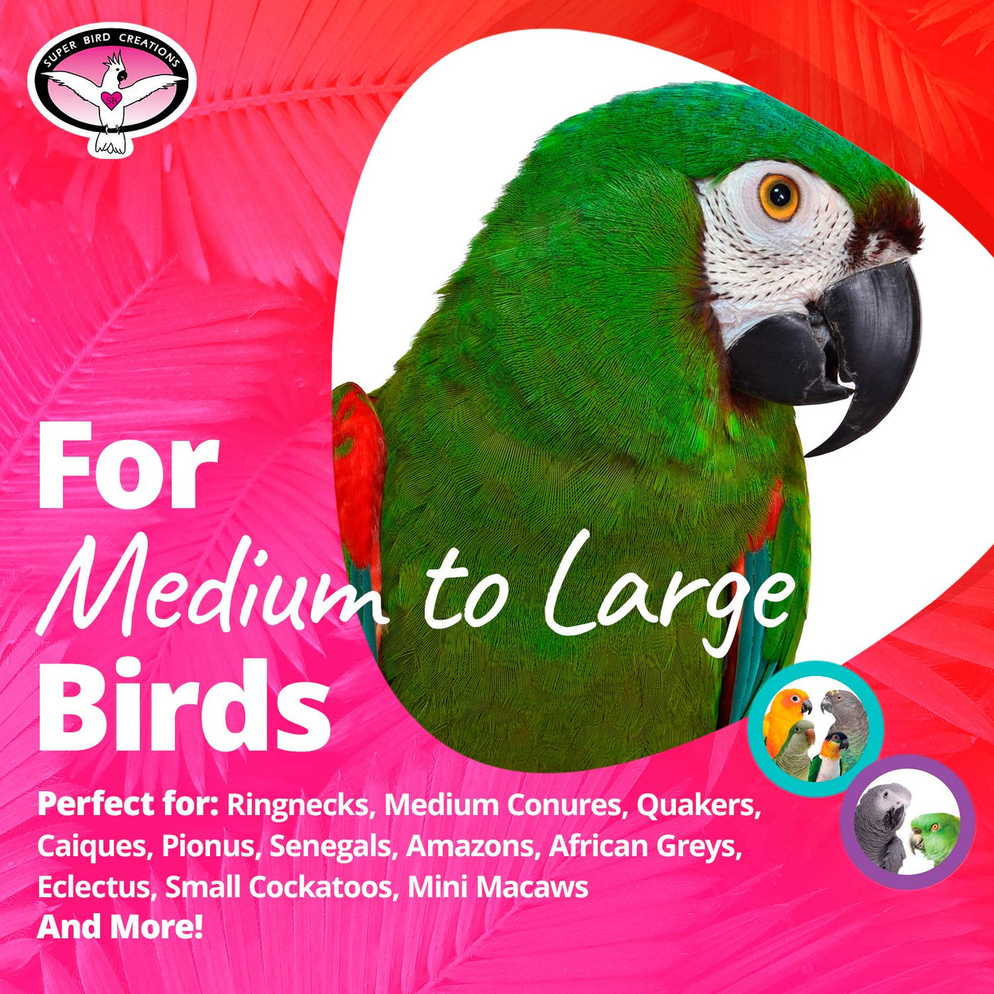 Q: What size birds is the Super Bird Creations Maraca Rattle suitable for?A: The Super Bird Creations Maraca Rattle is designed for medium to large birds, including species such as Amazons, African greys, Eclectus, Small Cockatoos, and Mini Macaws.
