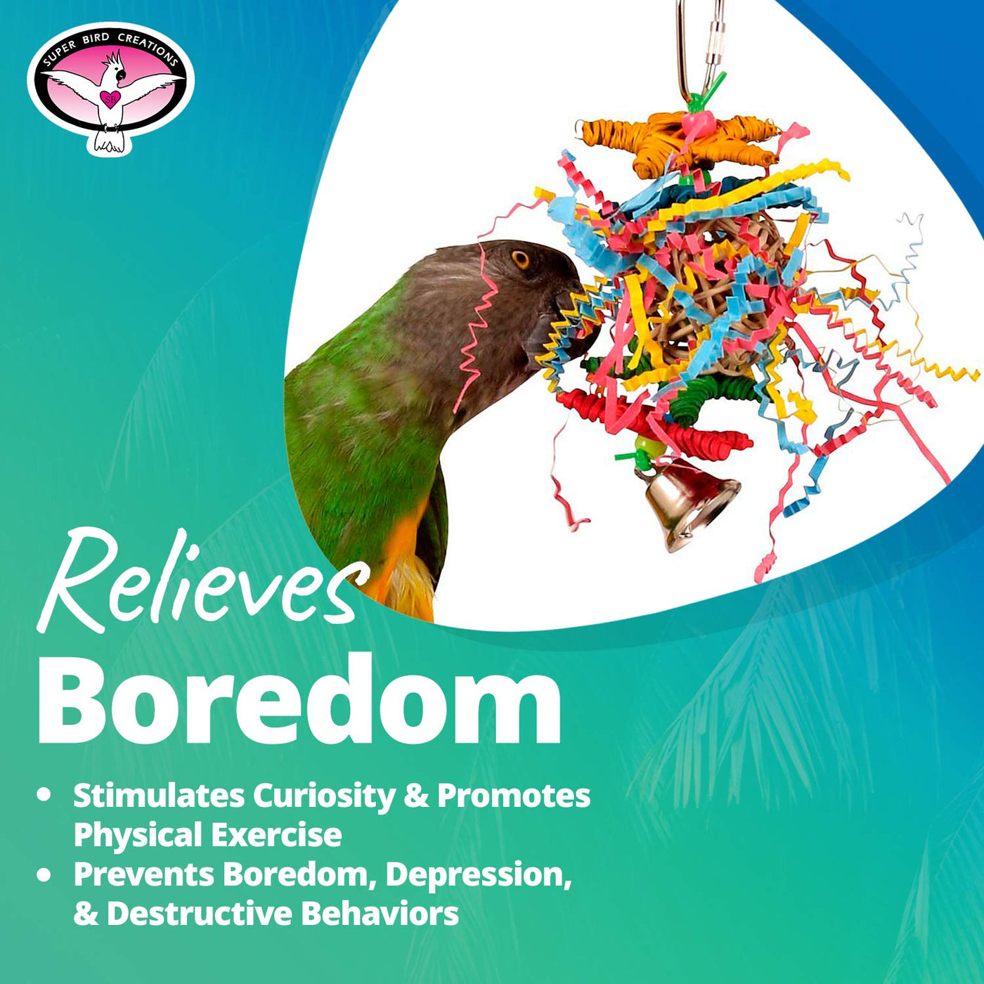 Q: How does this bird toy promote mental stimulation?A: This toy features a variety of textures, including crunchy and soft components, which stimulate your bird's innate curiosity and preening instincts. The engaging crinkle sounds and vibrant colors also keep birds entertained, enhancing their overall mental well-being.