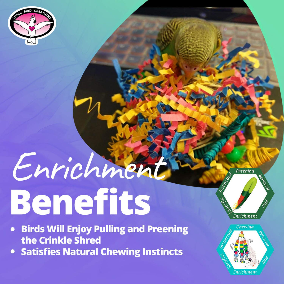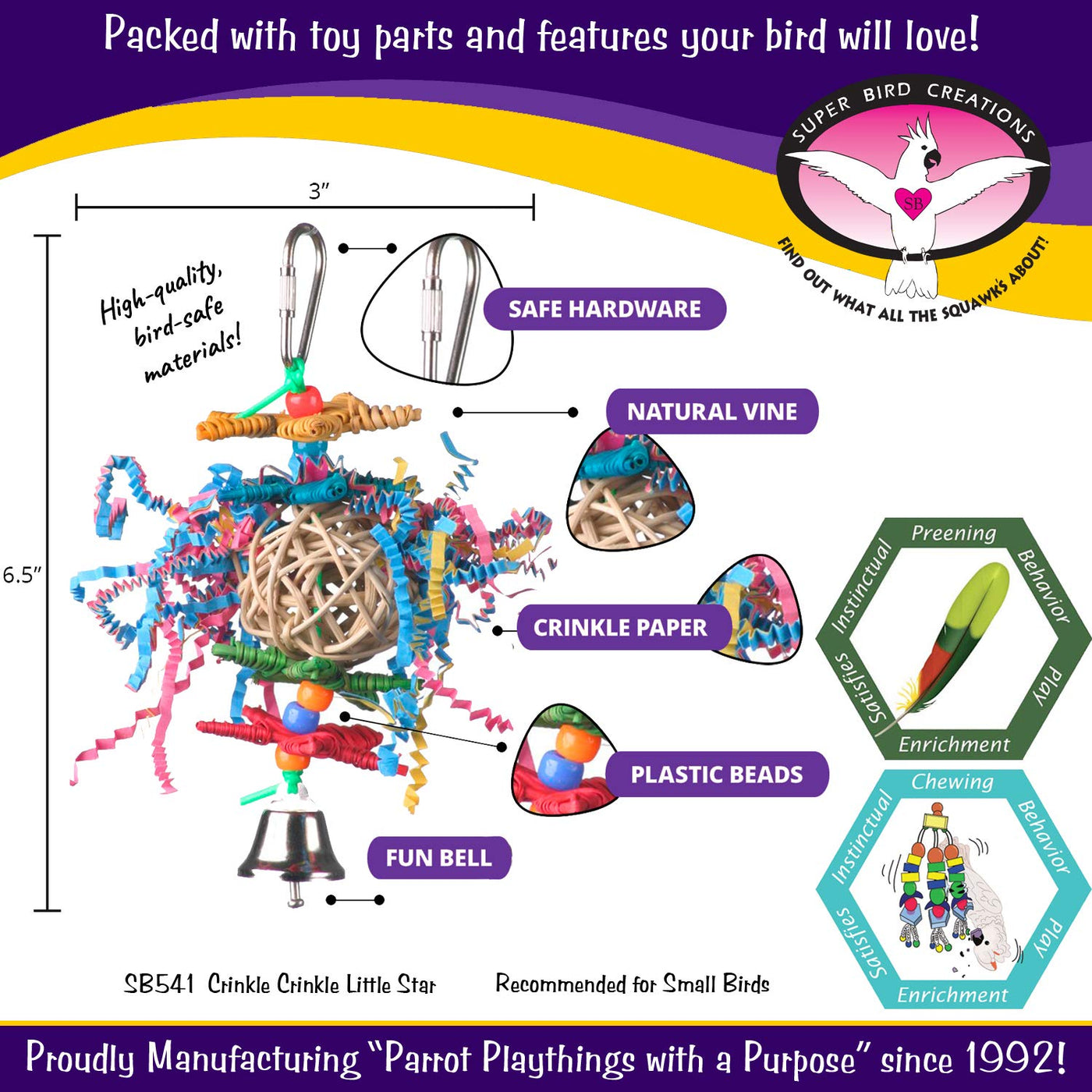 🌟 ENGAGING DESIGN: The Crinkle Crinkle Little Star Bird Toy features a charming star-shaped design measuring 6' x 2', providing the perfect size for small birds to explore and enjoy. The vibrant colors and intriguing crinkle textures make this toy an instant favorite in your feathered friend's playtime repertoire. | 👌 PERFECT SIZE FOR SMALL BIRDS: Tailored for small bird breeds, such as Parrotlets, Parakeets, Cockatiels, Lovebirds and similarly sized pet birds, this toy provides the ideal amount of challenge and stimulation for their size. Foster physical activity and mental well-being in your avian friend. | 🌟 Fun and Engaging : The Crinkle Crinkle Little Star is crafted to enhance your bird's environment with a variety of textures, both crunchy and soft. Perfect for pulling and preening, crinkle shred fosters an engaging experience for your feathered companion. It stimulates their innate curiosity and satisfies preening instincts. The crunchy vine components will please birds who love to chew. | 🌈 COLORFUL VARIETY: The SB541 is adorned with an array of visually stimulating colors, capturing your bird's attention and brightening up their living space. The combination of hues creates an enticing visual display, keeping your feathered companion happily engaged. | 🏡 BIRD SAFE COMPONENTS & DESIGN: As avian professionals worldwide recommend our products, we take pride in offering a chewable bird toy that prioritizes the safety and enrichment of pets. Super Bird Creations ensures that only the finest toy components are used, giving bird owners confidence in providing their feathered friends with a product designed for both entertainment and safety.