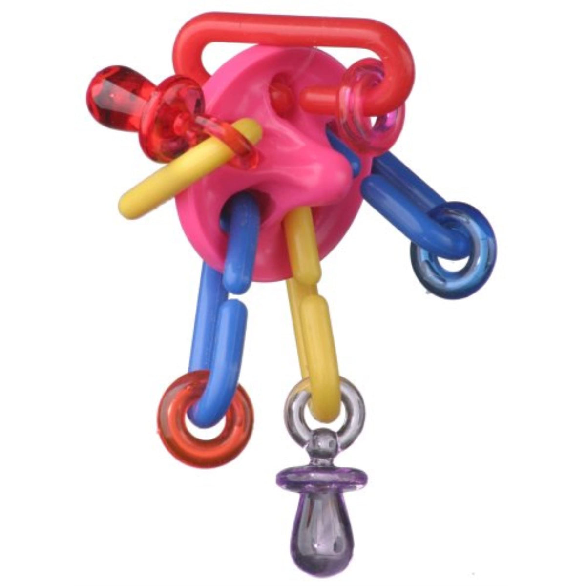 A colorful High impact plastic top adorned with plastic links holding translucent rings and pacifiers.