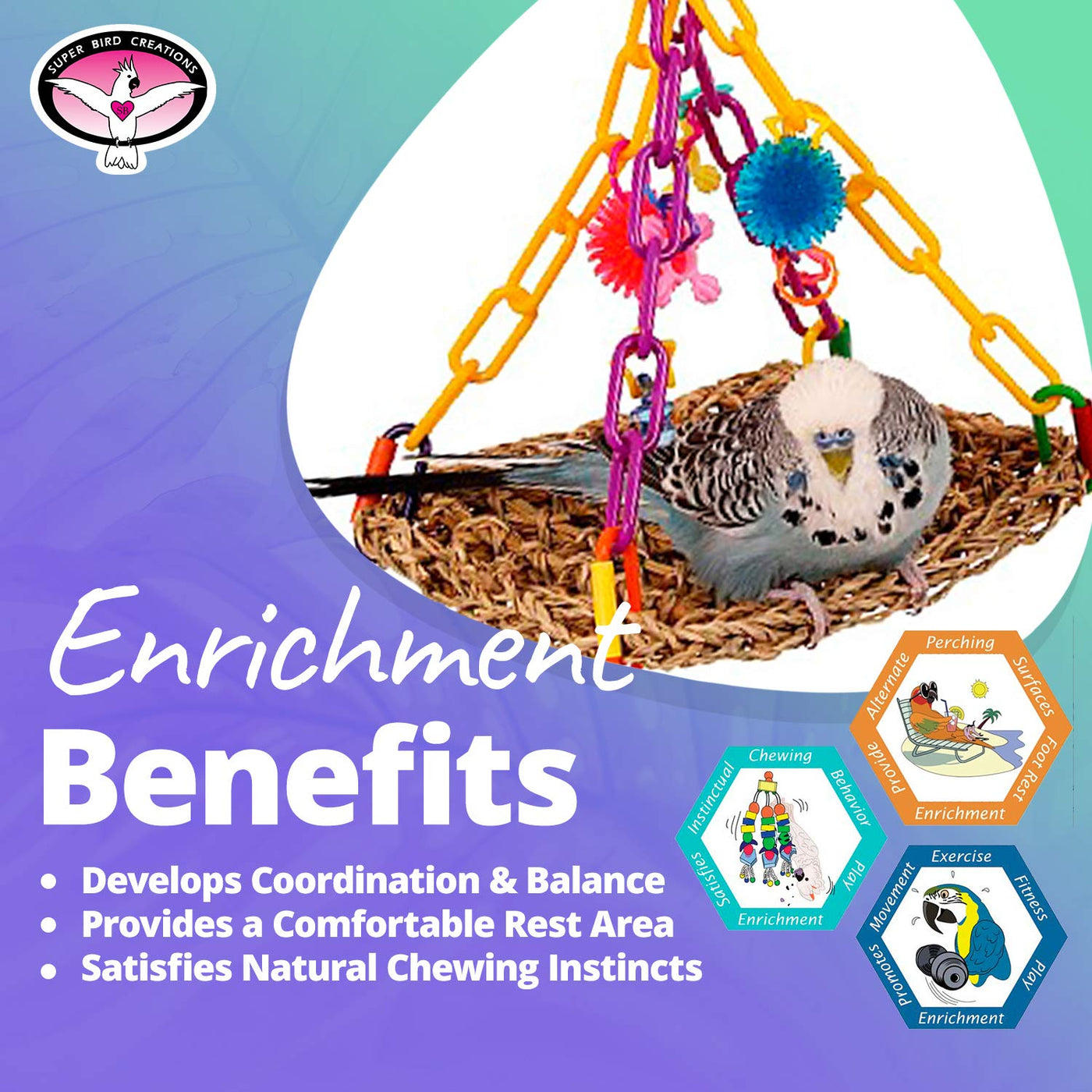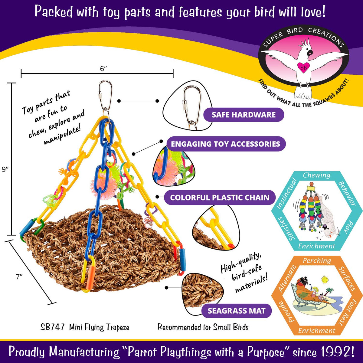 FOR SMALL BIRDS – The Mini Flying Trapeze bird toy by Super Bird Creations is the perfect size for perfect size for Parrotlets, Parakeets, Cockatiels, Lovebirds and similarly sized pet birds. | DESIGN FEATURES – This bird toy is crafted with a seagrass mat suspended by colorful plastic chain decorated with fun to explore toy parts. Utilizing a diverse selection of stimulating materials, colors, textures and shapes make Super Bird Creations toys of maximum interest to pet birds. | ENRICHMENT BENEFITS - the Mini Flying Trapeze meets numerous enrichment needs. The easy to replace seagrass mat is a favorite of many birds to chew. The swinging platform promotes exercise, helps to develop coordination and balance skills and also provides a comfortable alternative rest area. | RELIEVES BOREDOM – Properly designed bird toys are more than “just toys”. Super Bird Creations parrot toys are “Playthings with a Purpose” that help to ward off boredom, depression, aggression and destructive behaviors in parrots by stimulating physical activity, curiosity and mental engagement. | BIRD SAFE COMPONENTS & DESIGN – Recommended by avian professionals worldwide, our products are expertly designed to maximize the safety and enrichment benefits to pet parrots. Bird owners can be confident that only the finest toy components are used. Proudly assembled in the USA since 1992. | Age range description: all life stages